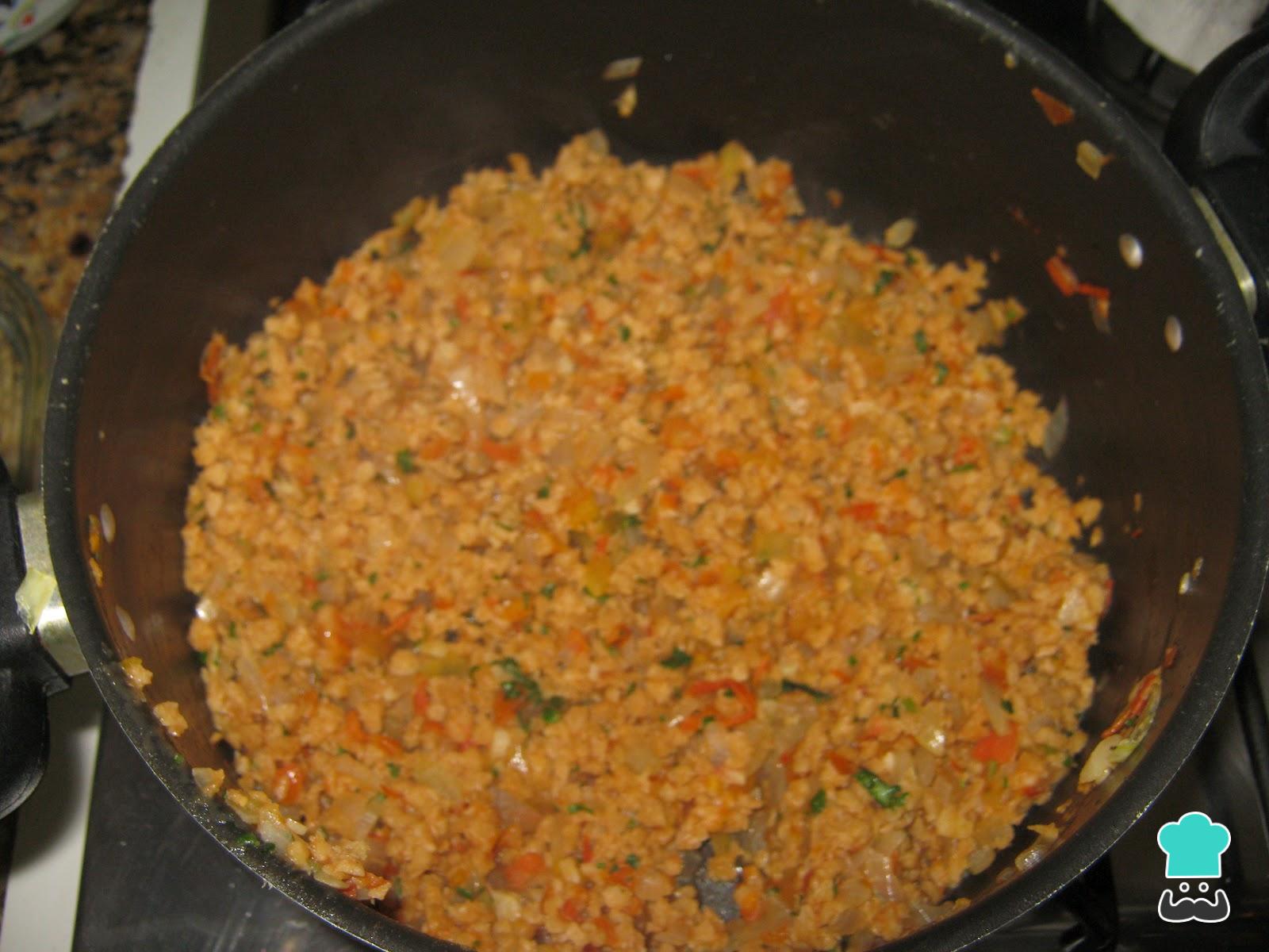 Adicione a proteína de soja, misture bem para que absorva os sabores do refogado, e acrescente a água. Deixe ferver até secar e desligue o fogo.