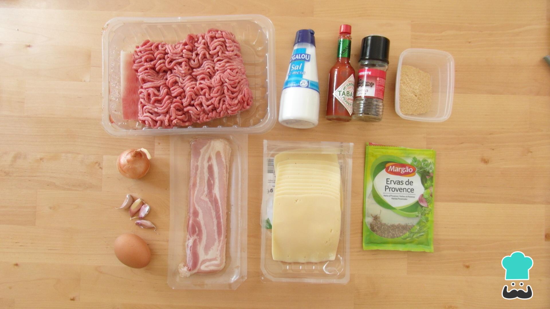 Para fazer este delicioso hambúrguer recheado com queijo e coberto com bacon, comece por reunir os ingredientes.