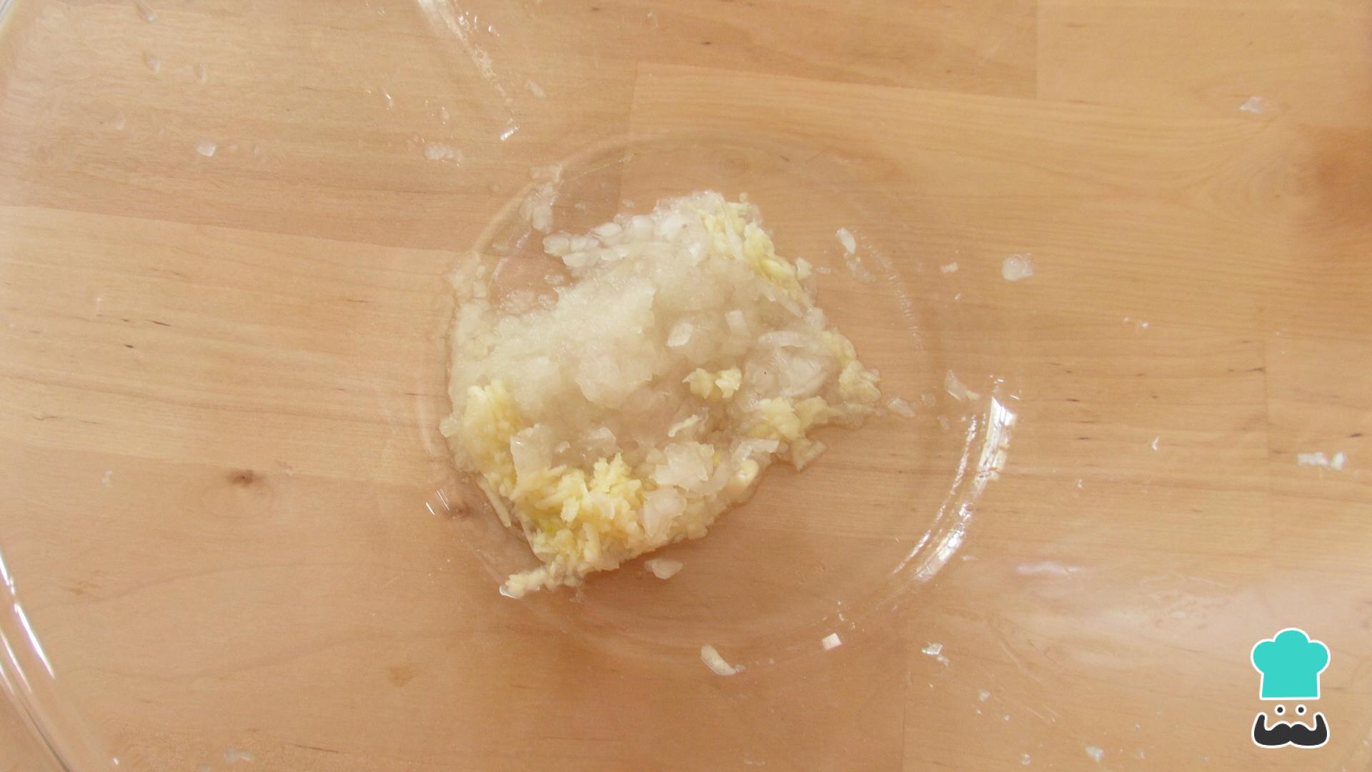 Descasque a cebola e os alhos, e rale ou pique finamente para uma tigela.