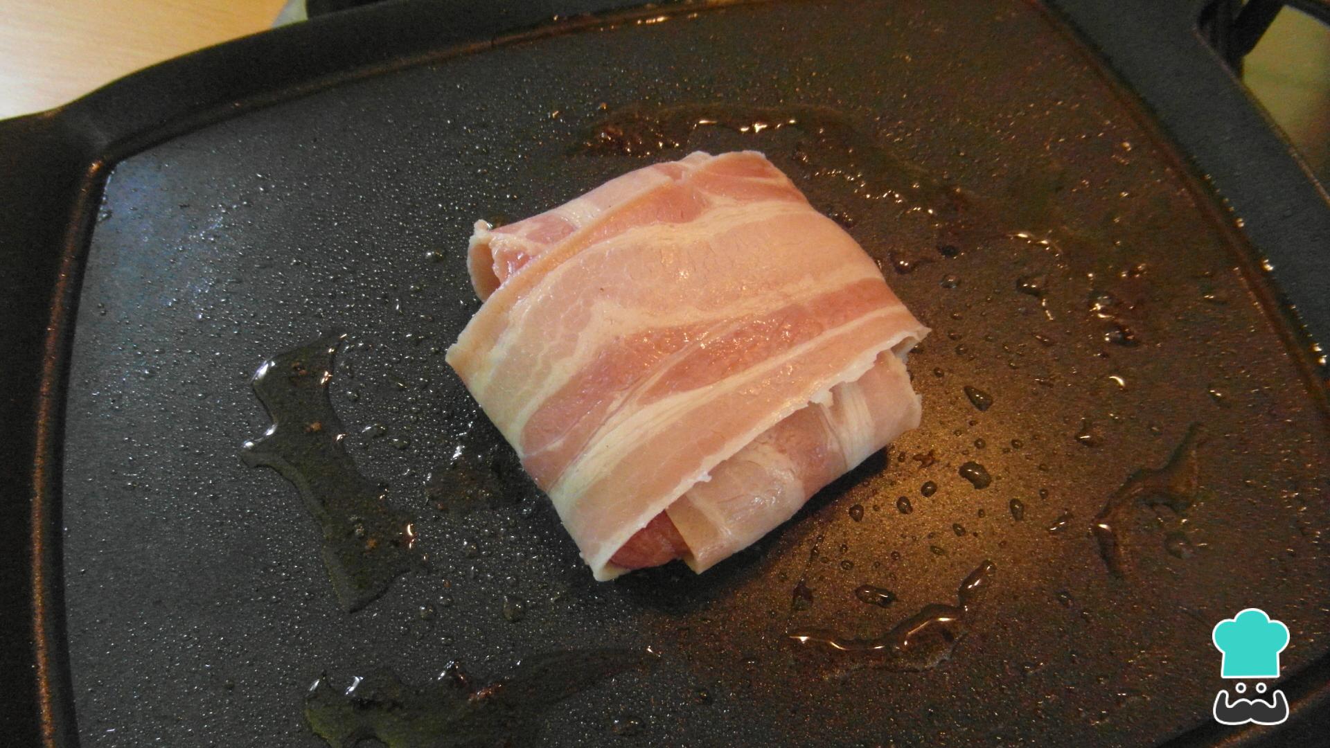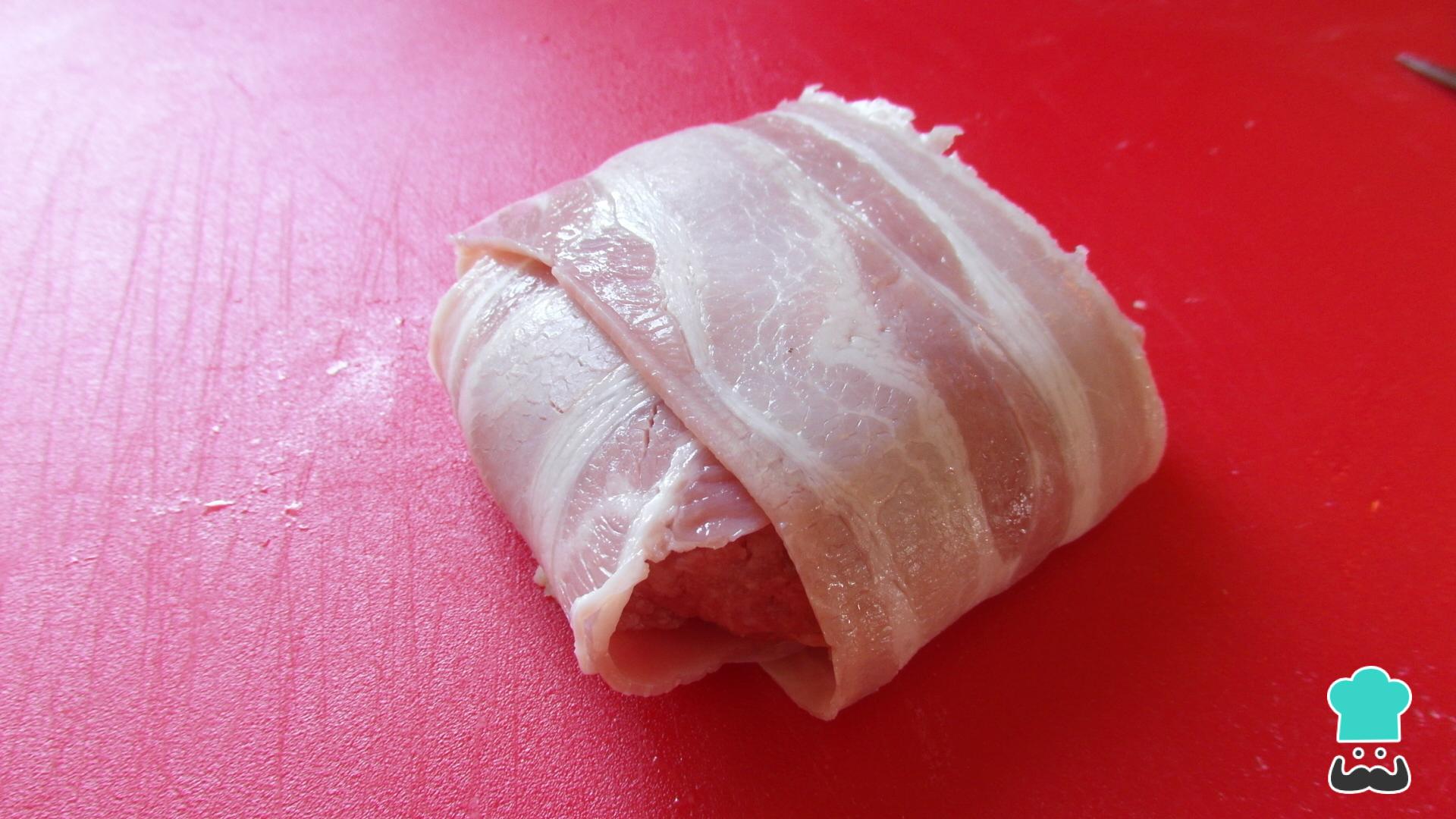 Pressione os dois hambúrgueres com a palma da mão, de forma a que fiquem bem compactos, e embrulhe com duas tiras de bacon, como na imagem.