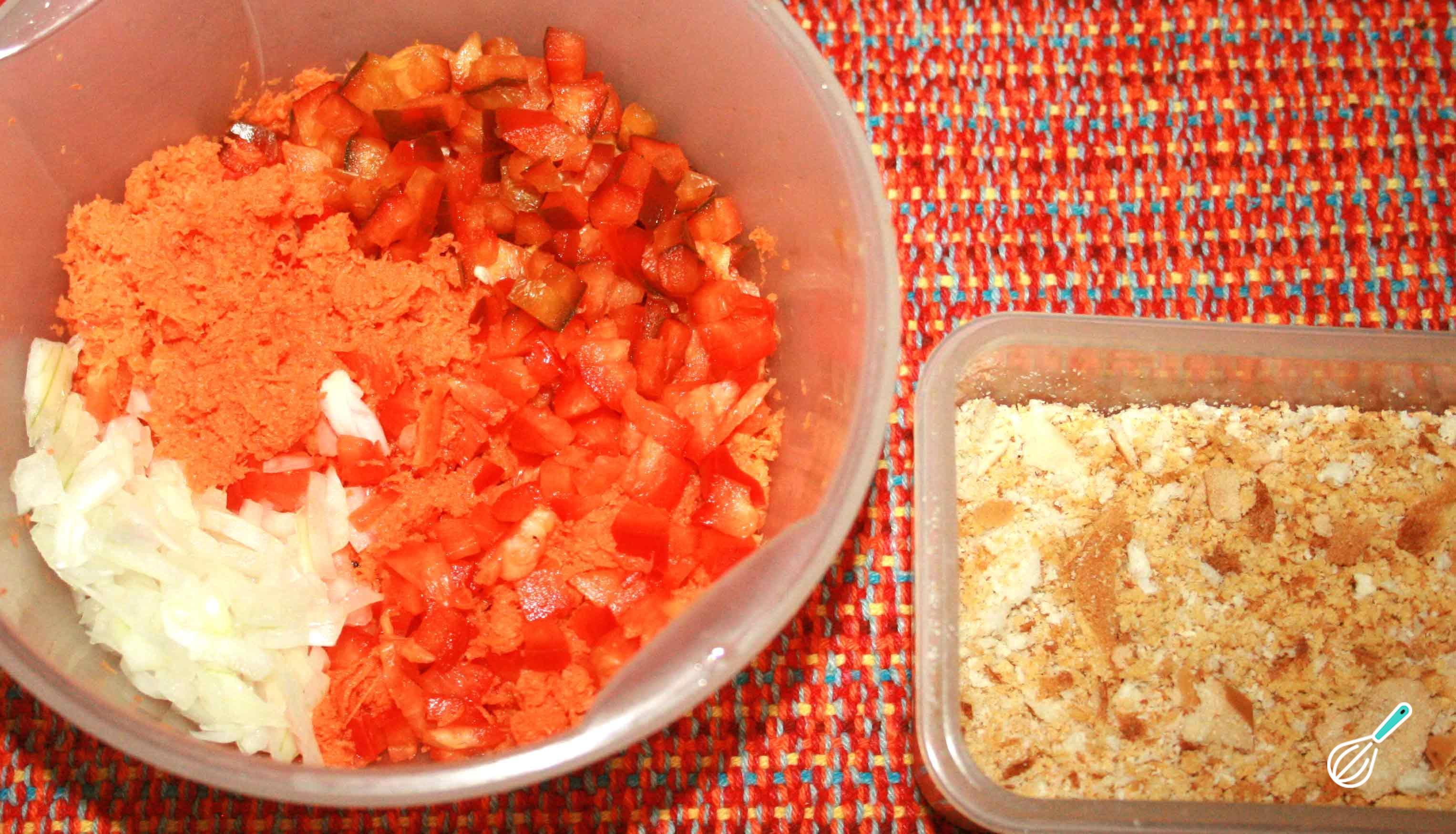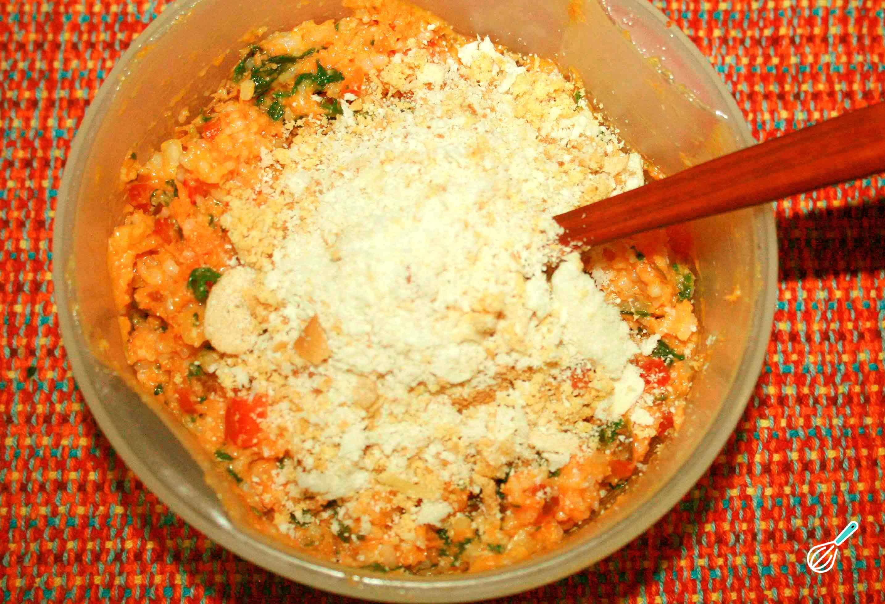 Adicione a farinha de rosca vegana e misture, até todos os ingredientes estarem bem integrados.