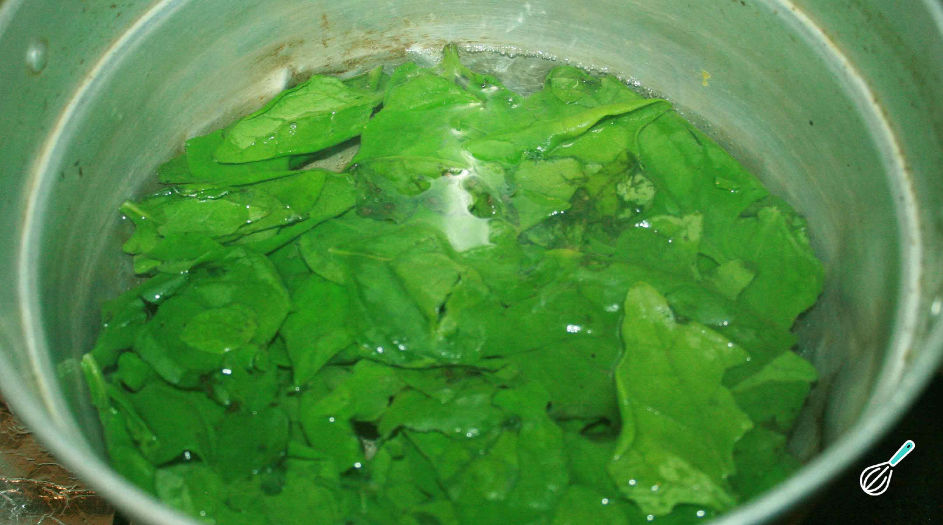 Cozinhe o espinafre, em uma panela com água e sal a gosto. Deixe levantar fervura por três a cinco minutos em fogo alto.