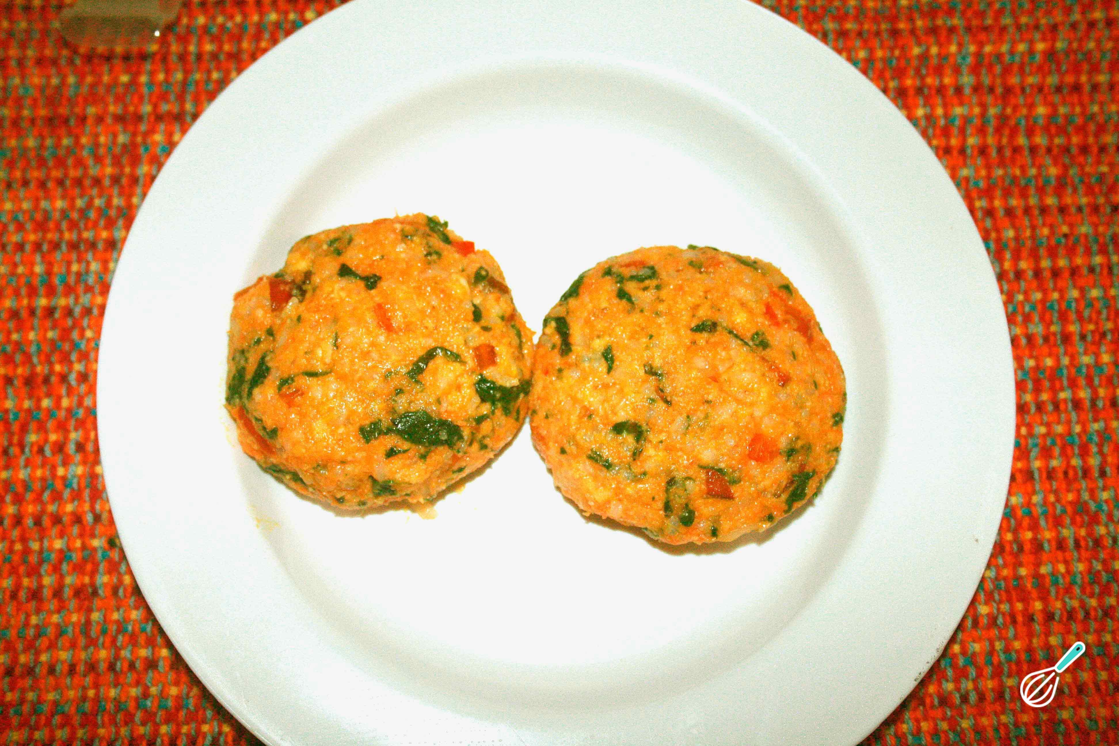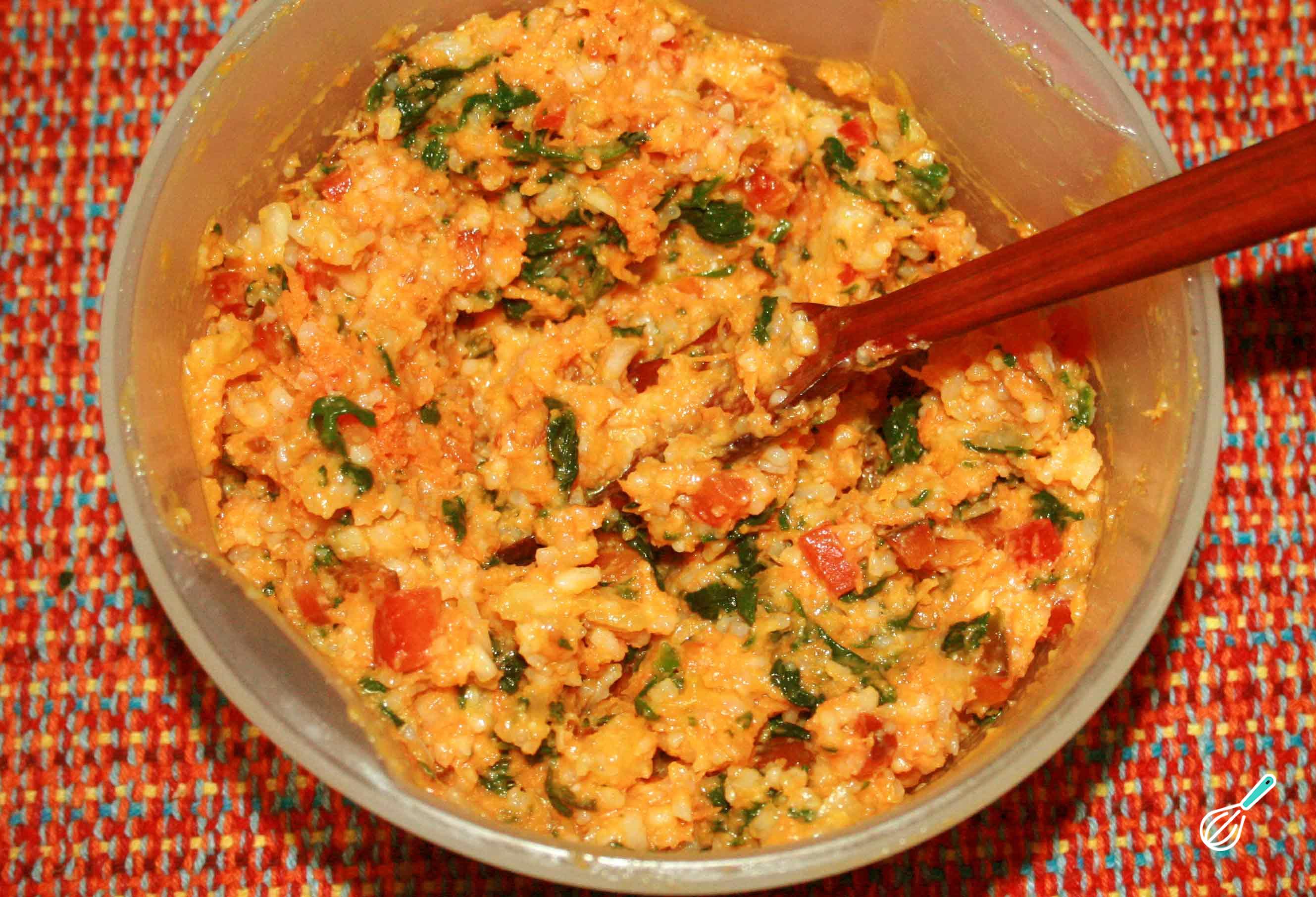 Em uma taça coloque o pimentão, a cebola, a cenoura, o espinafre, o alho e todos os condimentos. Misture muito bem, até obter uma massa homogênea, de seguida junte o arroz cozido e misture de novo.