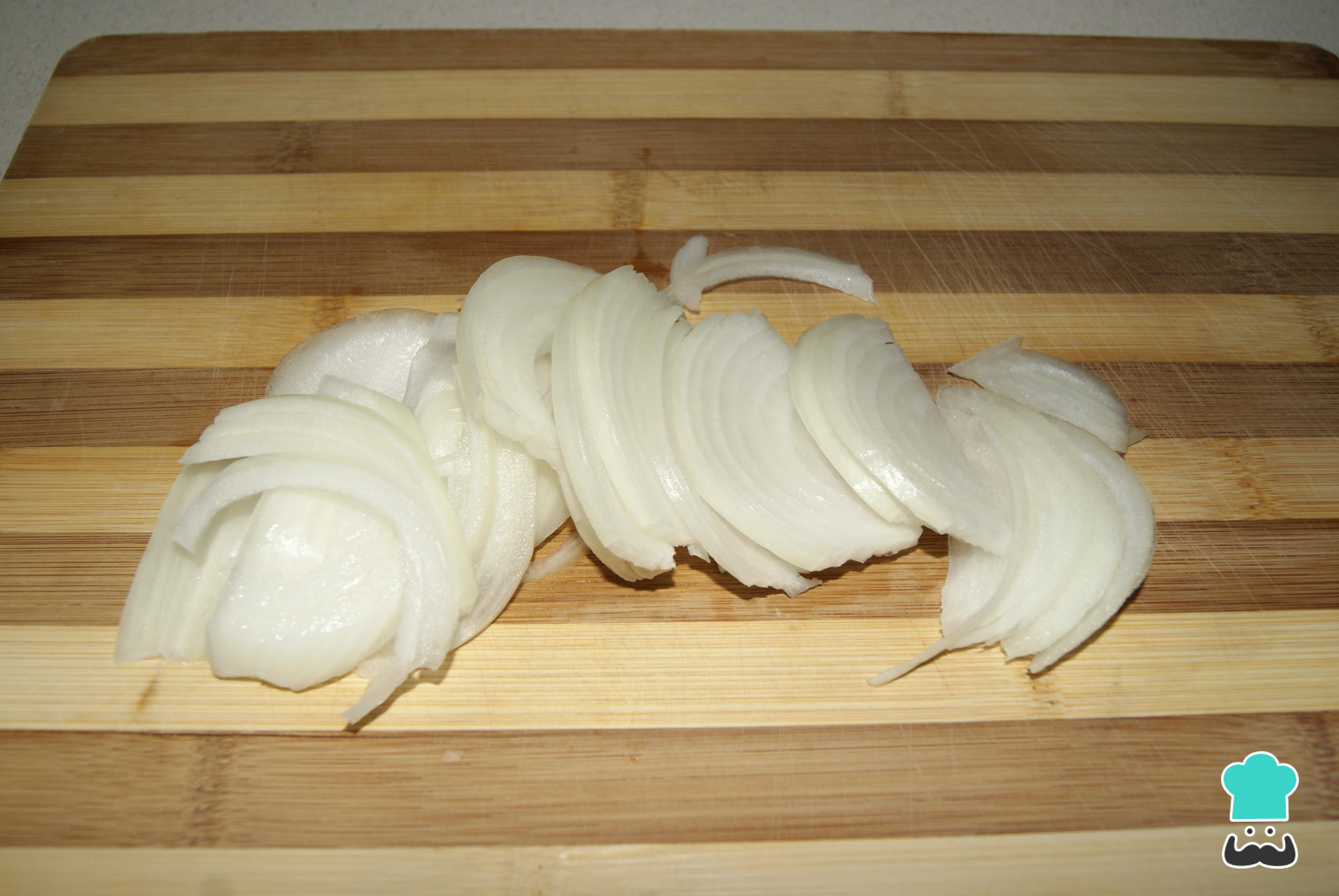 O primeiro passo desta receita de hambúrguer grelhado com cebolas caramelizadas é descascar a cebola e cortar em juliana.