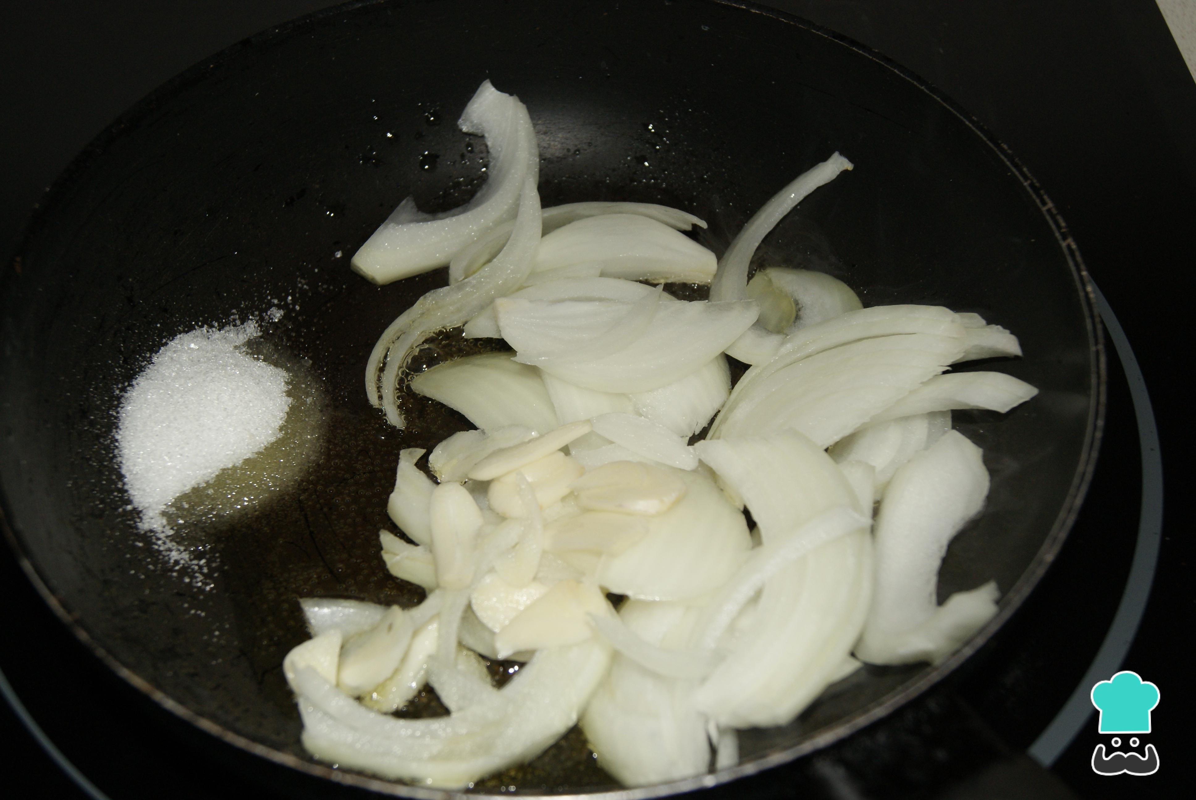 Coloque ambos os ingredientes numa frigideira em fogo médio-baixo com o azeite de oliva e o açúcar. Deixe cozinhar, mexendo de vez em quando, até a cebola ficar marrom.