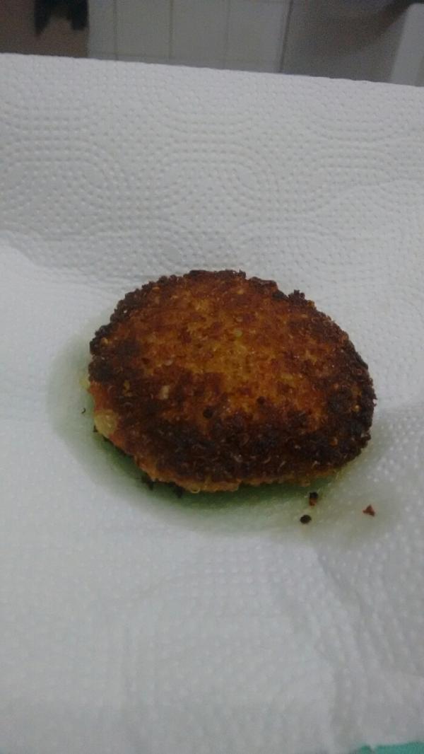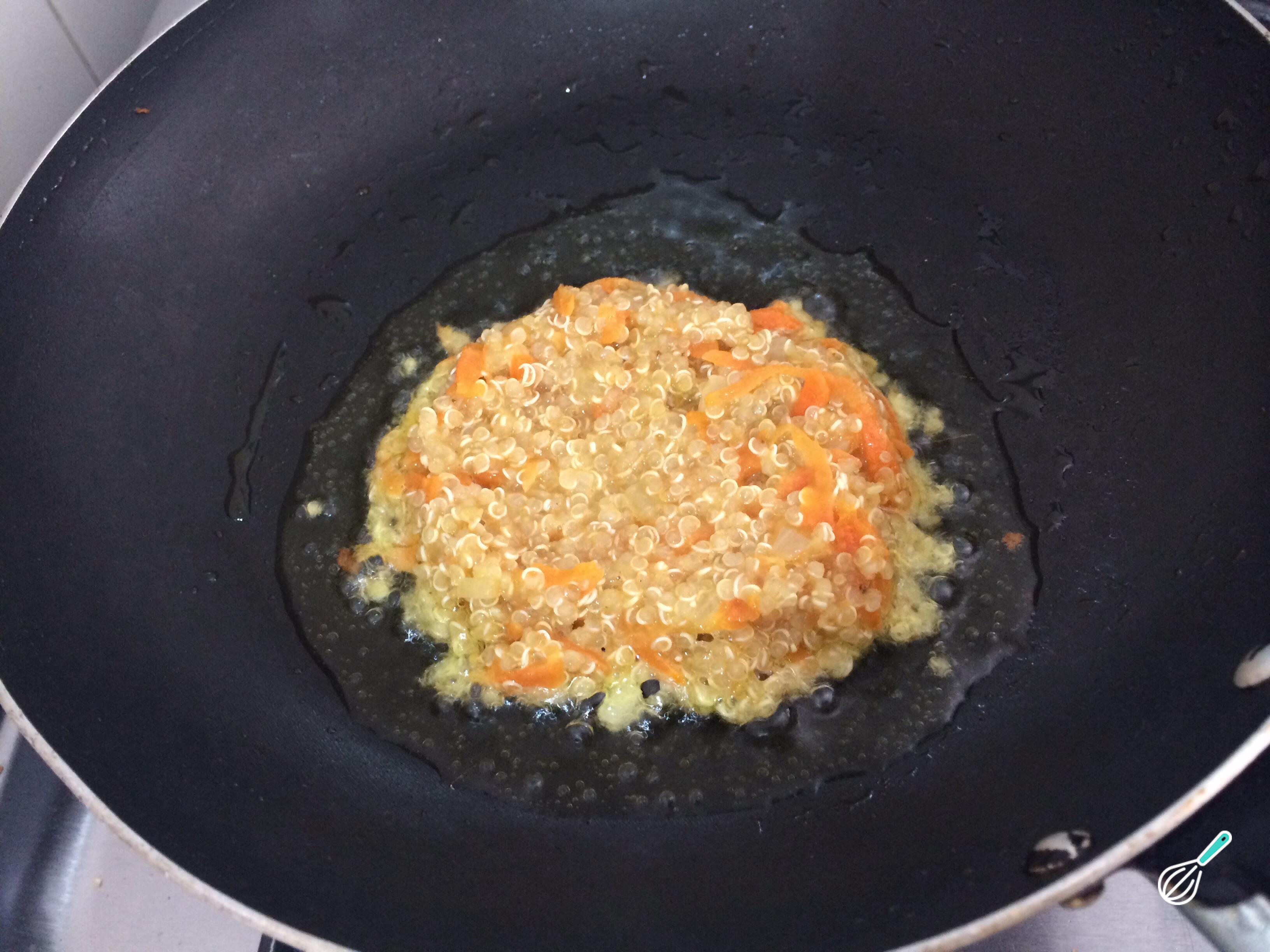 Em uma panela com um pouco de azeite, adicione duas colheres de sopa da mistura anterior, achate ligeiramente e cozinhe por 4 minutos de ambos os lados, até dourar. Coloque o hambúrguer de quinoa e cenoura escorrendo em papel toalha e repita com a restante mistura.