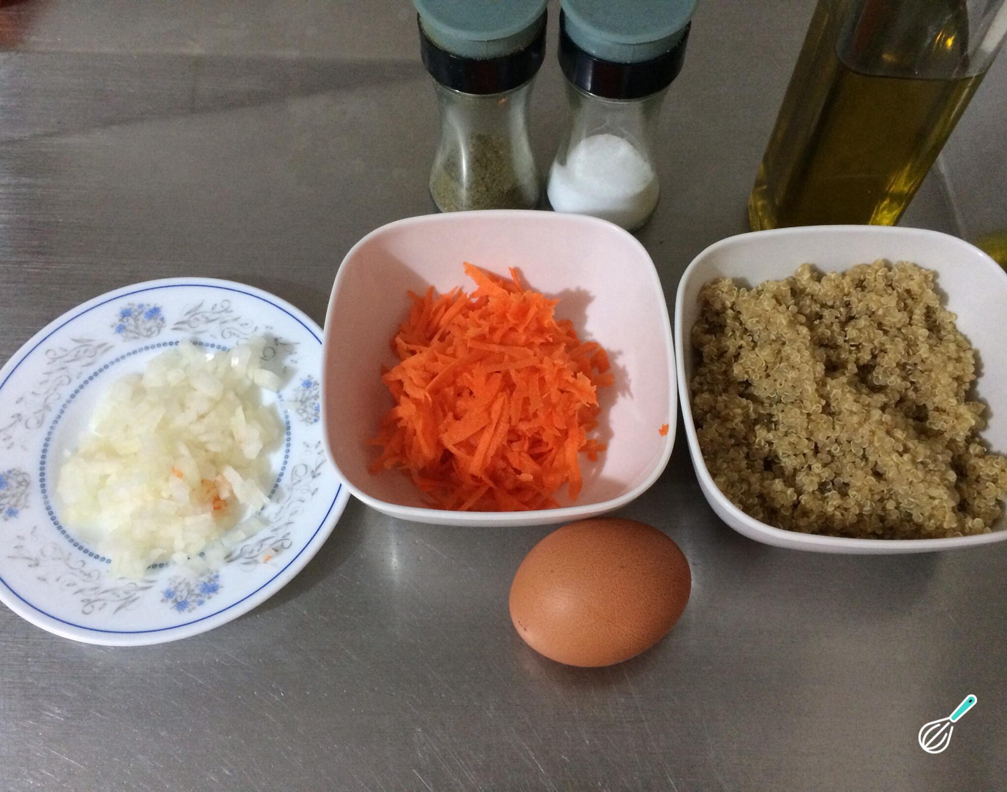 Antes de preparar estes hambúrgueres de quinoa e cenoura crocantes, o primeiro passo é preparar todos os ingredientes.