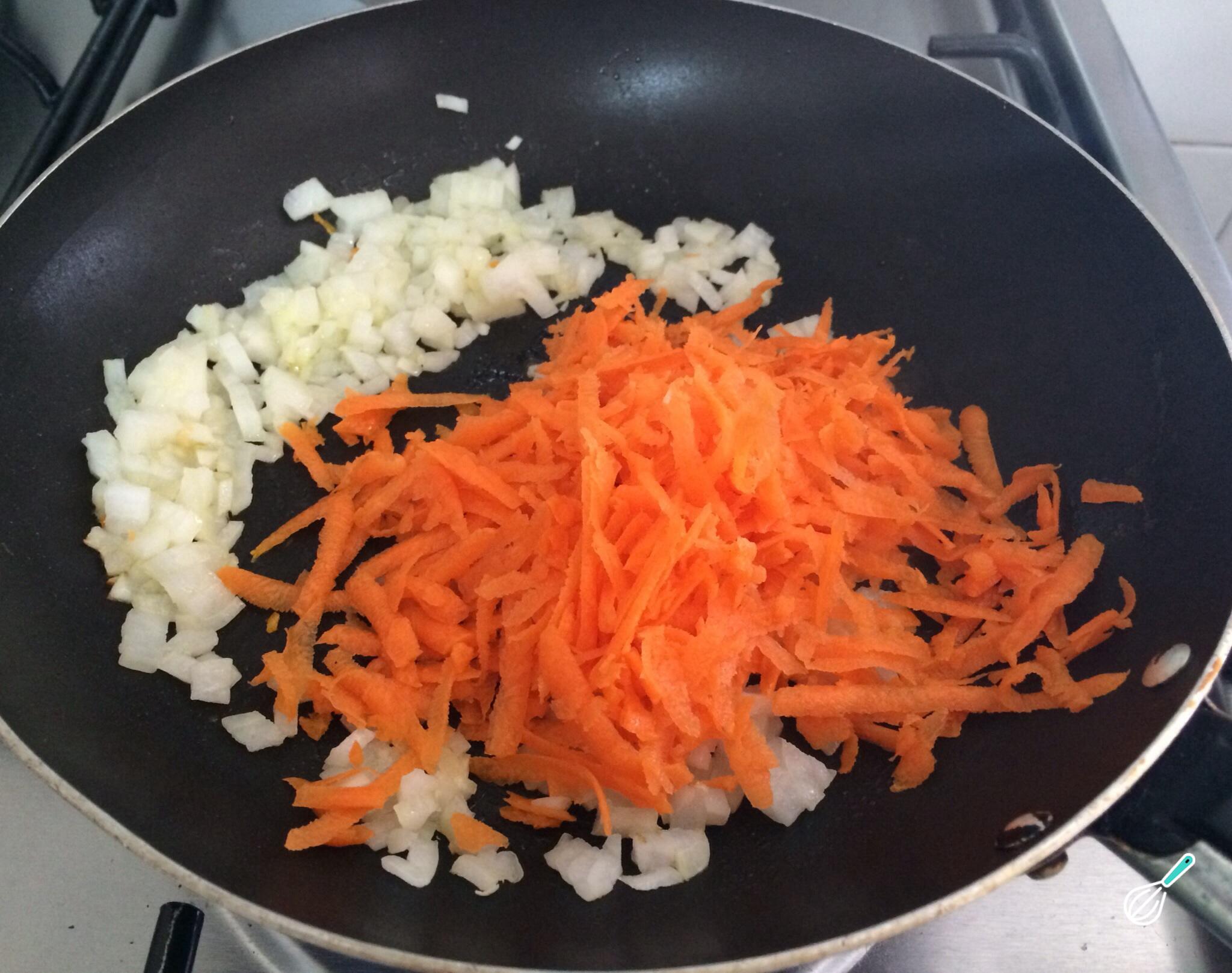 O próximo passo desta receita de hambúrgueres de quinoa e cenoura é, numa frigideira em fogo alto com azeite, refogar a cebola picada e a cenoura descascada, durante cerca de 5 minutos, ou até ficar dourada.