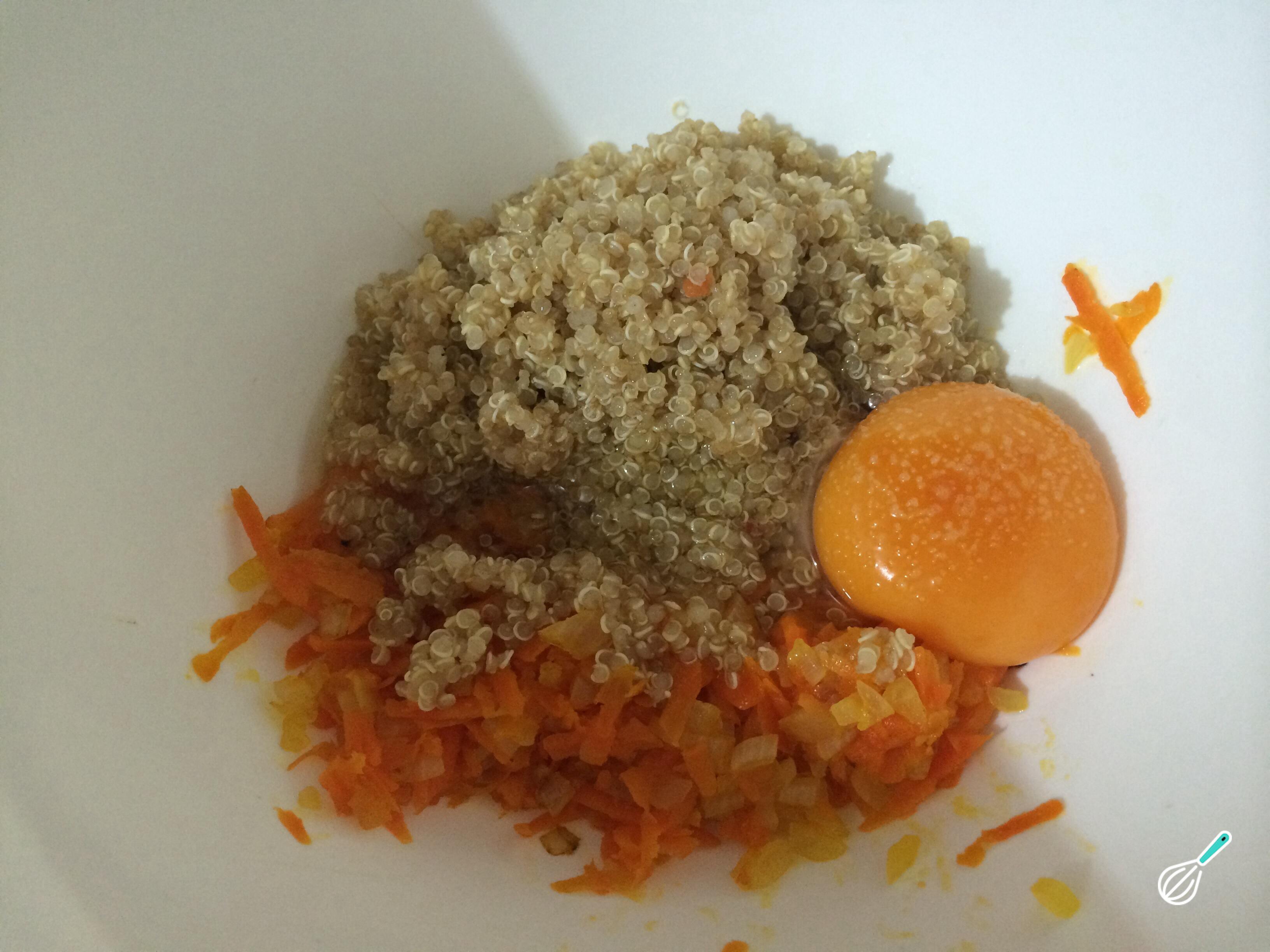 Após esse tempo, misture muito bem a cenoura e a cebola com a quinoa e o ovo. Tempere com sal e pimenta e reserve na geladeira por 20 minutos, para que fique mais consistente.