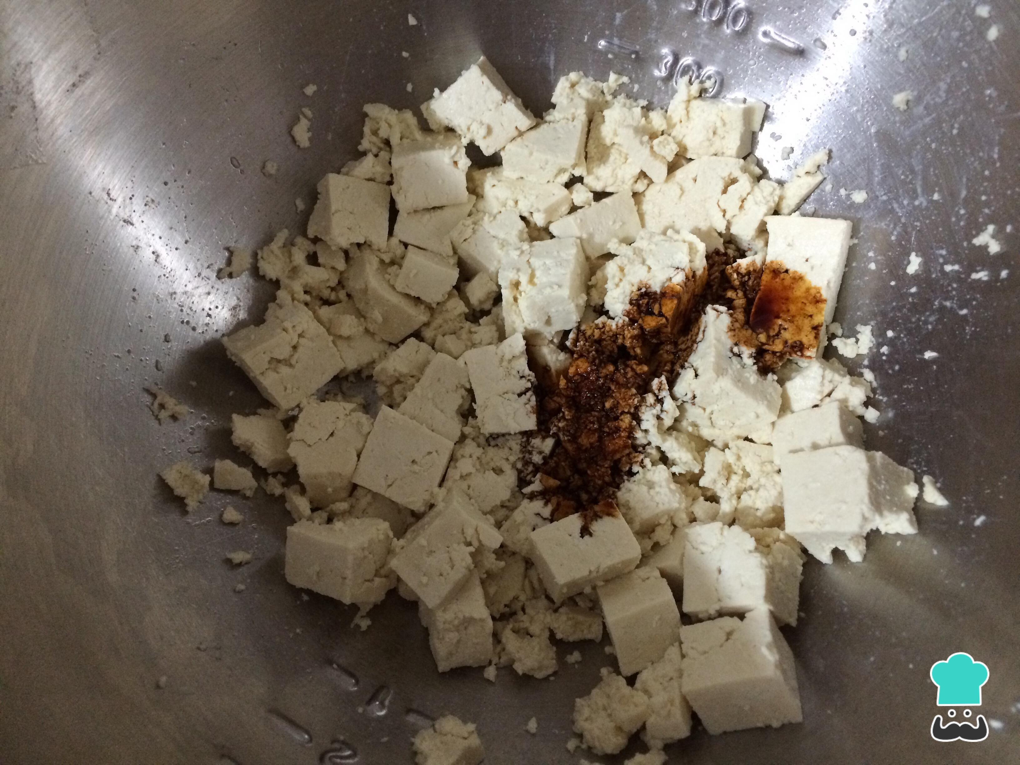 Coloque numa tigela o tofu cortado em cubos pequenos, as ervas finas e o molho de soja. Misture muito bem para desfazer o tofu.