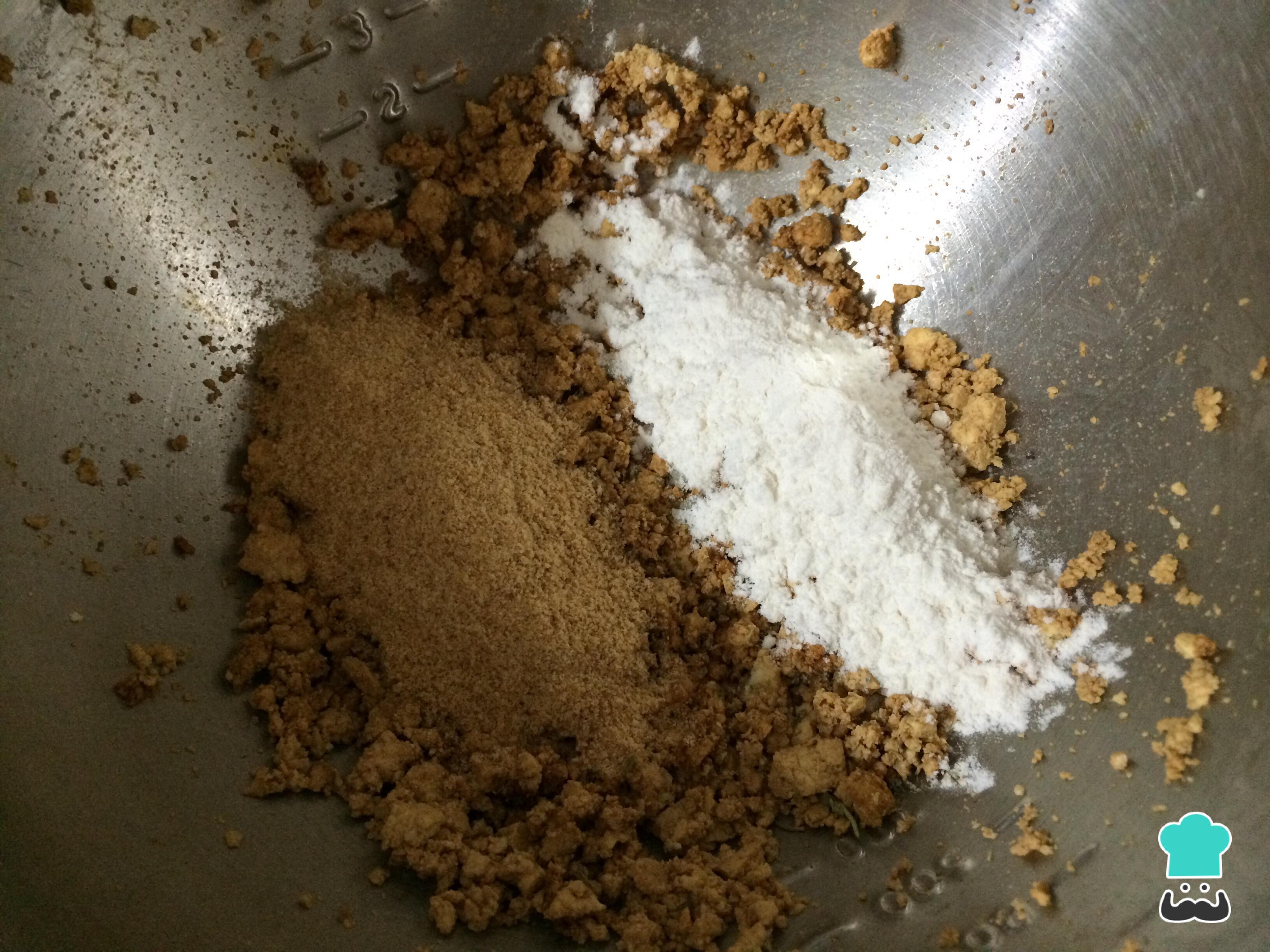 Acrescente a farinha e a farinha de rosca à mistura anterior de hambúrgueres de tofu, e misture tudo muito bem.