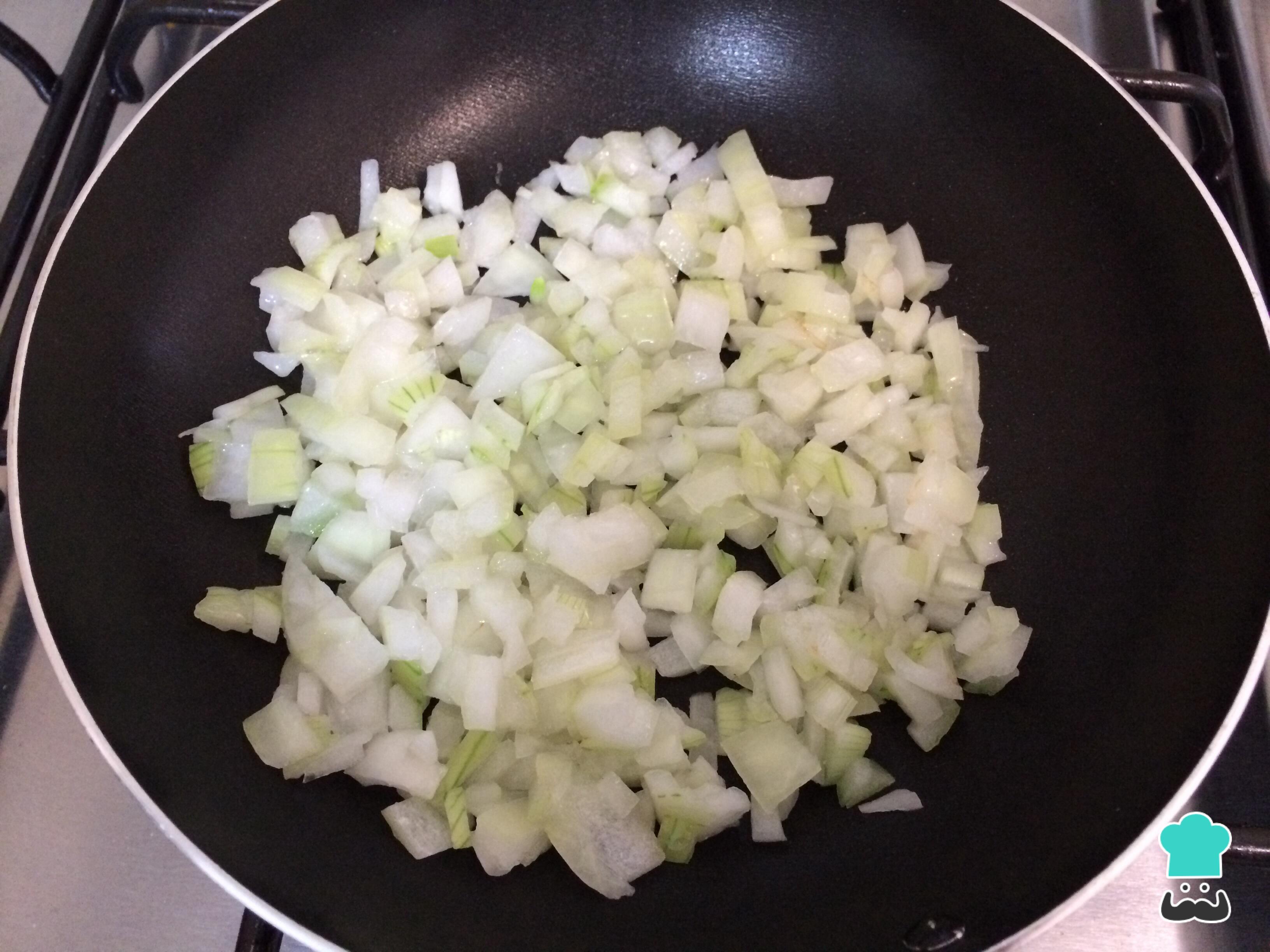 Numa frigideira em fogo baixo com óleo, refogue a cebola cortada em cubos pequenos, temperada de sal e pimenta e tampada, até que fique macia.