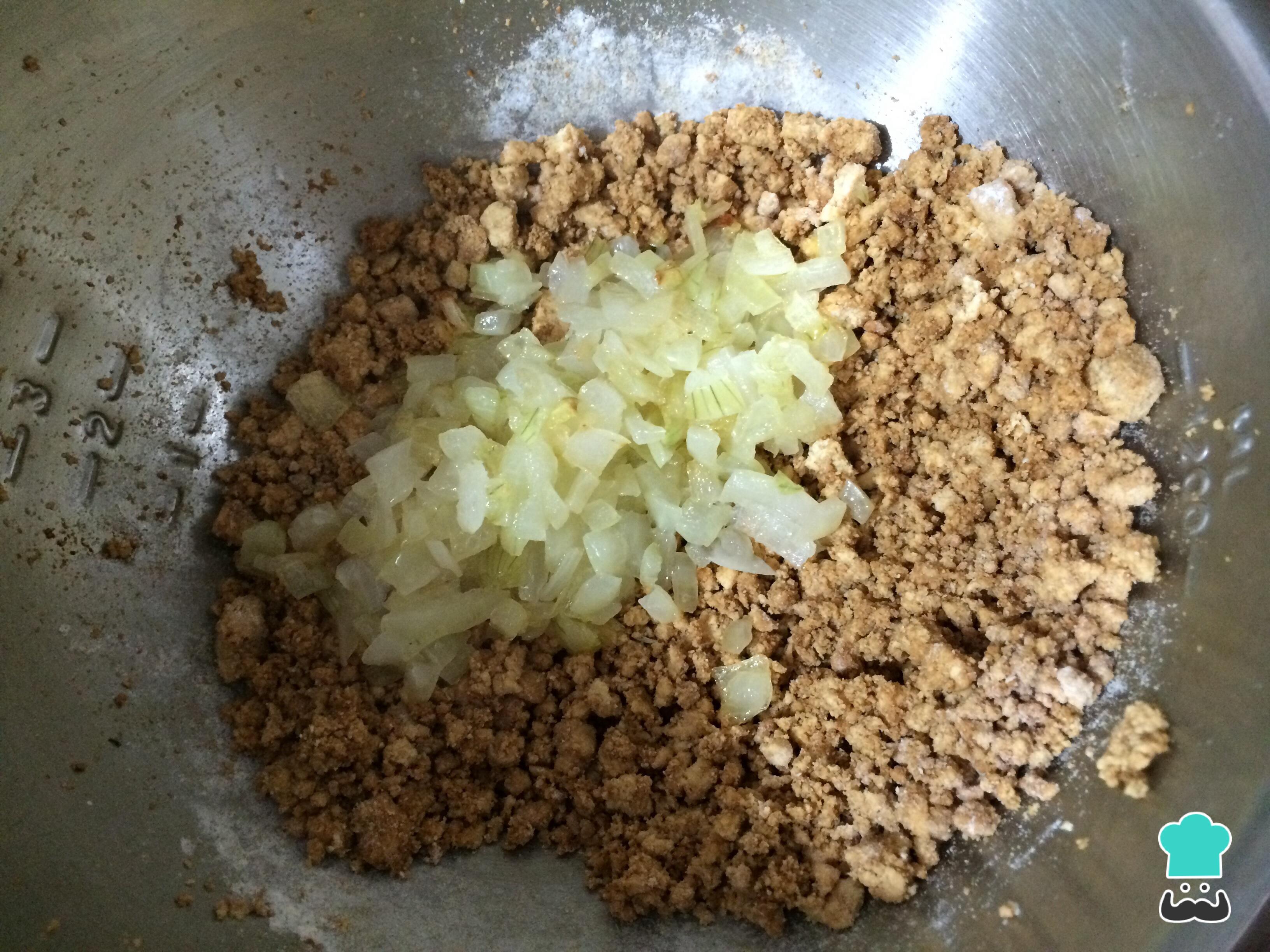 Acrescente a cebola à base do hambúrgueres de tofu preparada anteriormente. Retifique o sabor com sal e pimenta, adicione também um pouco de óleo para que, ao misturar, a massa se torne modelável.