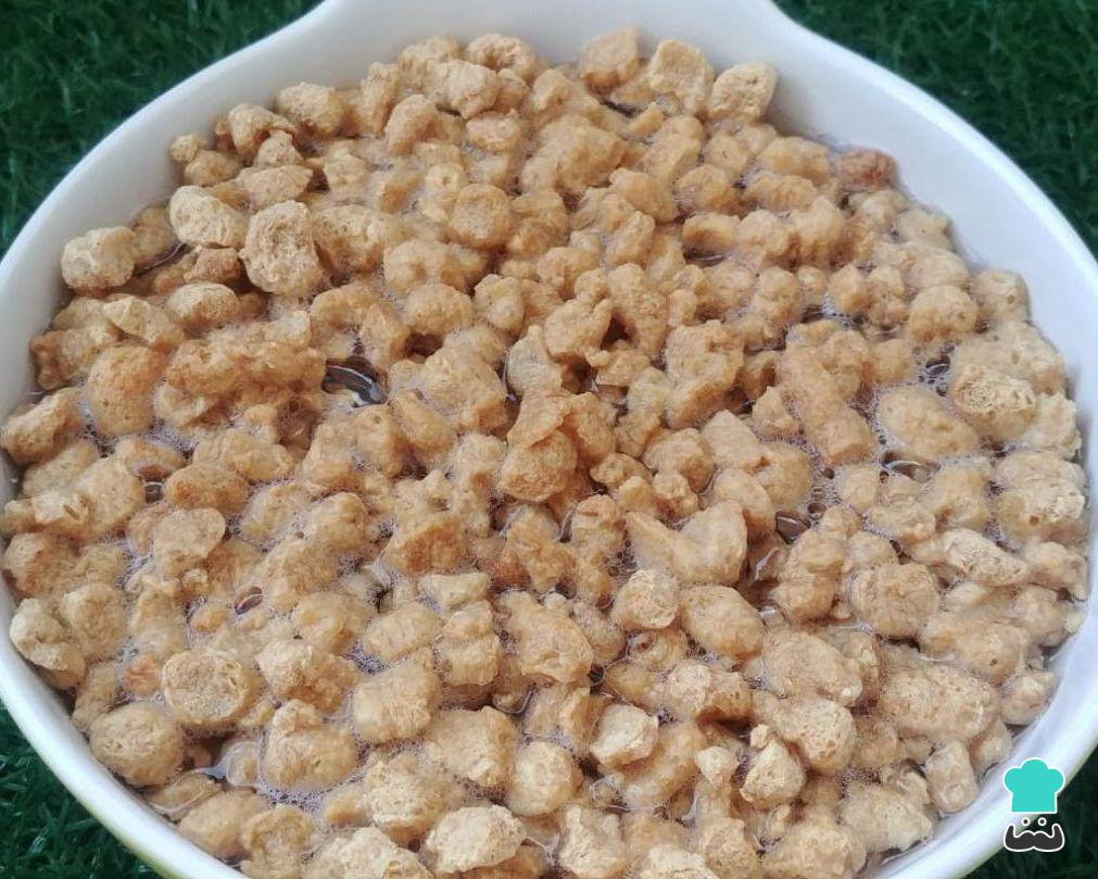 Primeiramente coloque a proteína de soja hidratando no caldo de legumes morno durante 20-30 minutos. Depois escorra e aperte bem com as mãos, para eliminar o excesso de líquido.