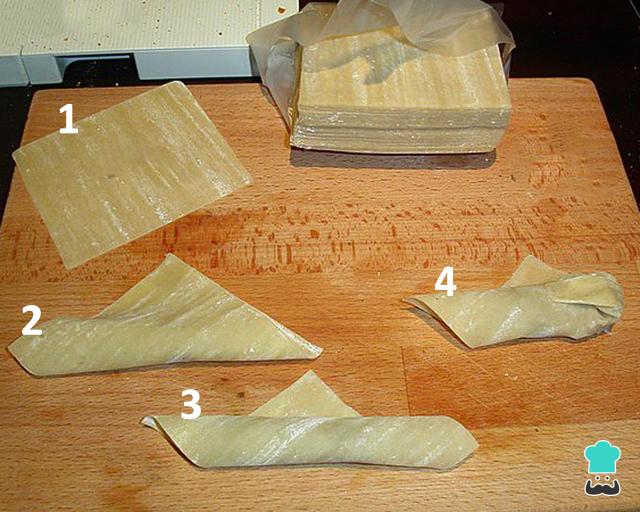 Dica: Recomendamos que use folhas de massa quadrada porque fica mais fácil para rechear. Umedeça as beiradas da massa com um pouco de água para grudar bem.