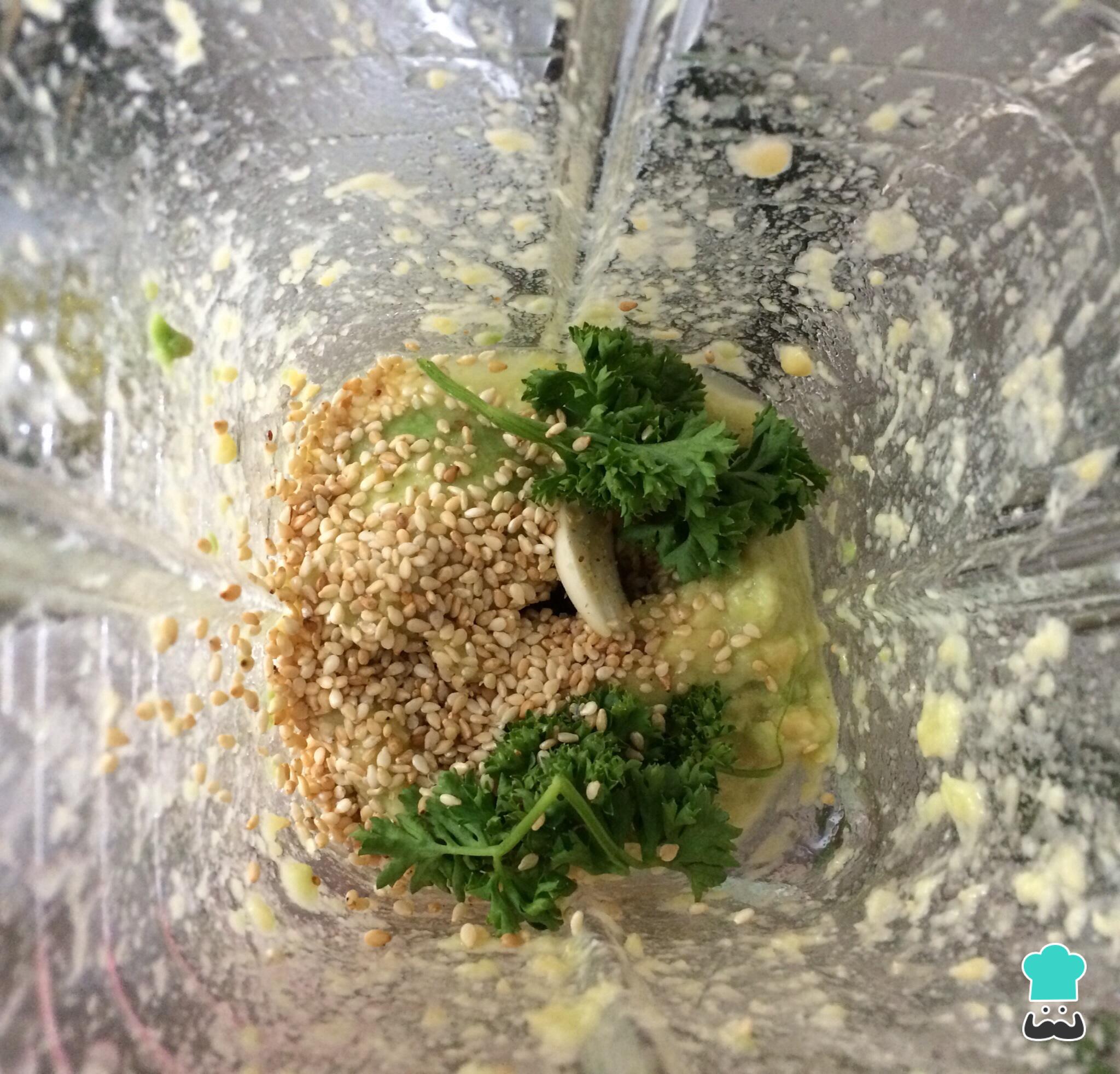 Quando tiver obtido uma pasta, acrescente o dente de alho, as sementes de gergelim, a salsinha, sal e pimenta a gosto. Volte a bater, até obter uma mistura homogênea.