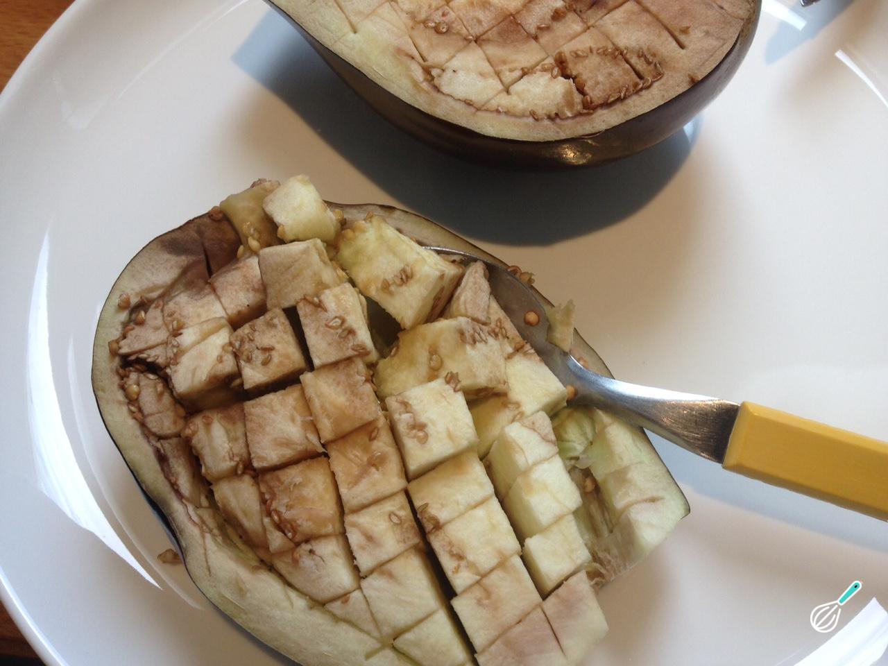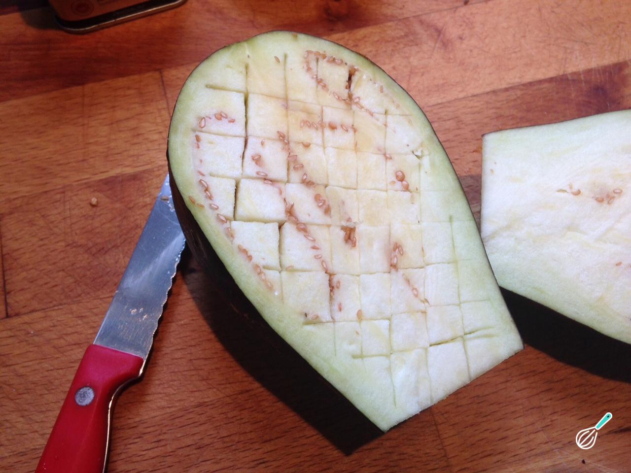 Corte a berinjela em duas metades e, em cada uma, faça alguns cortes na diagonal sobre a polpa, em ambas as direções. Pressione com a faca até chegar ao fundo, mas sem cortar a pele do alimento.