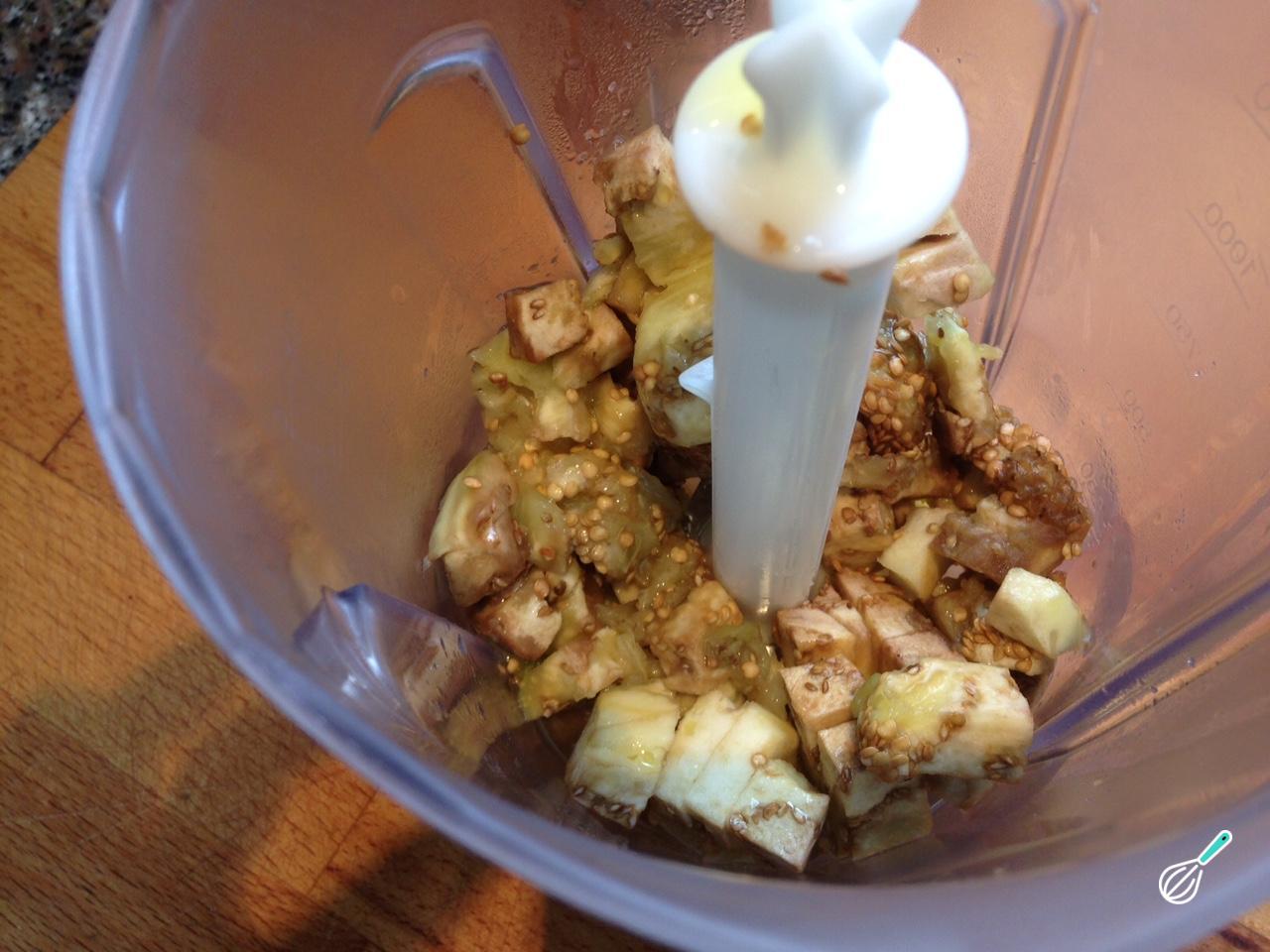 Introduza a polpa de berinjela no copo do liquidificador juntamente com o suco de meio limão e uma colher de sopa de azeite de oliva. Bata bem até obter um creme de berinjela.