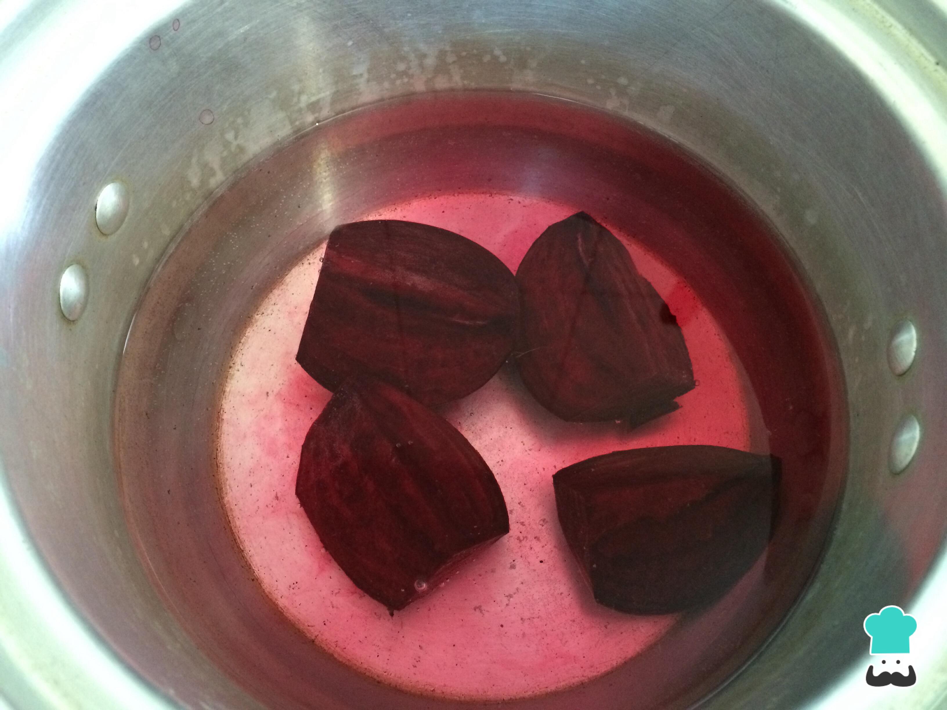 Numa panela à parte em fogo médio, cozinhe também a beterraba cortada em quartos, em água fervente por 45 minutos, ou até que esteja macia.