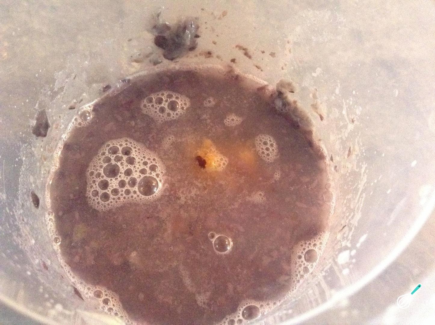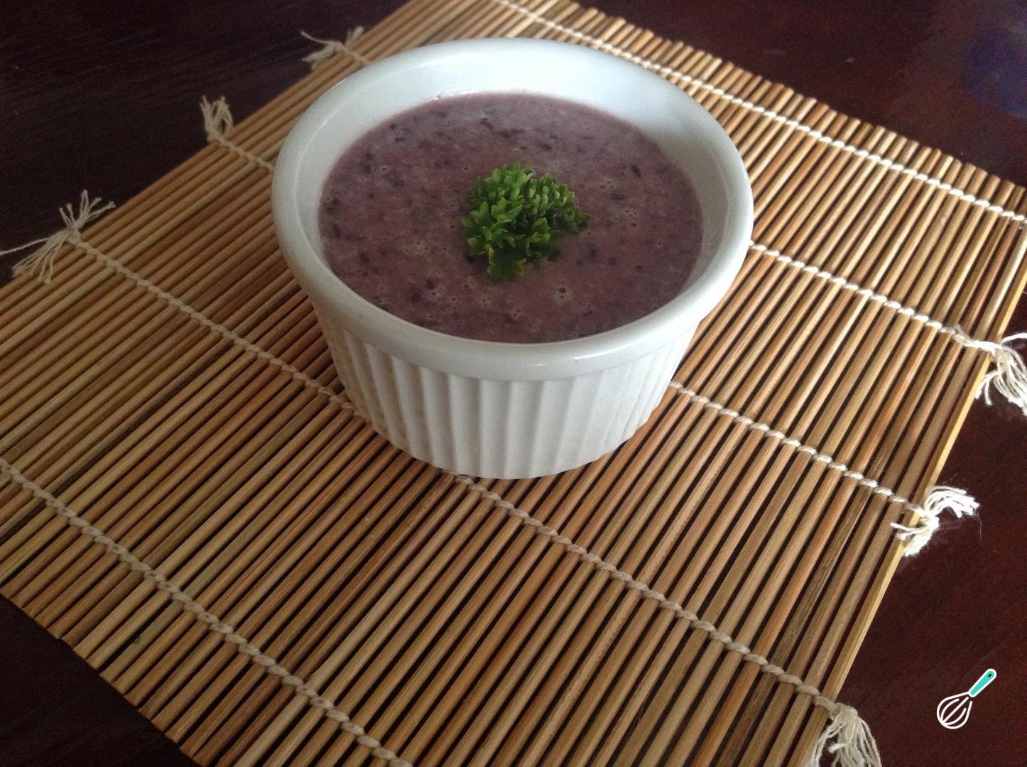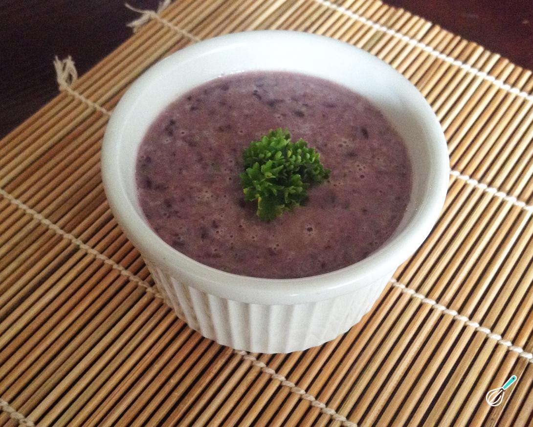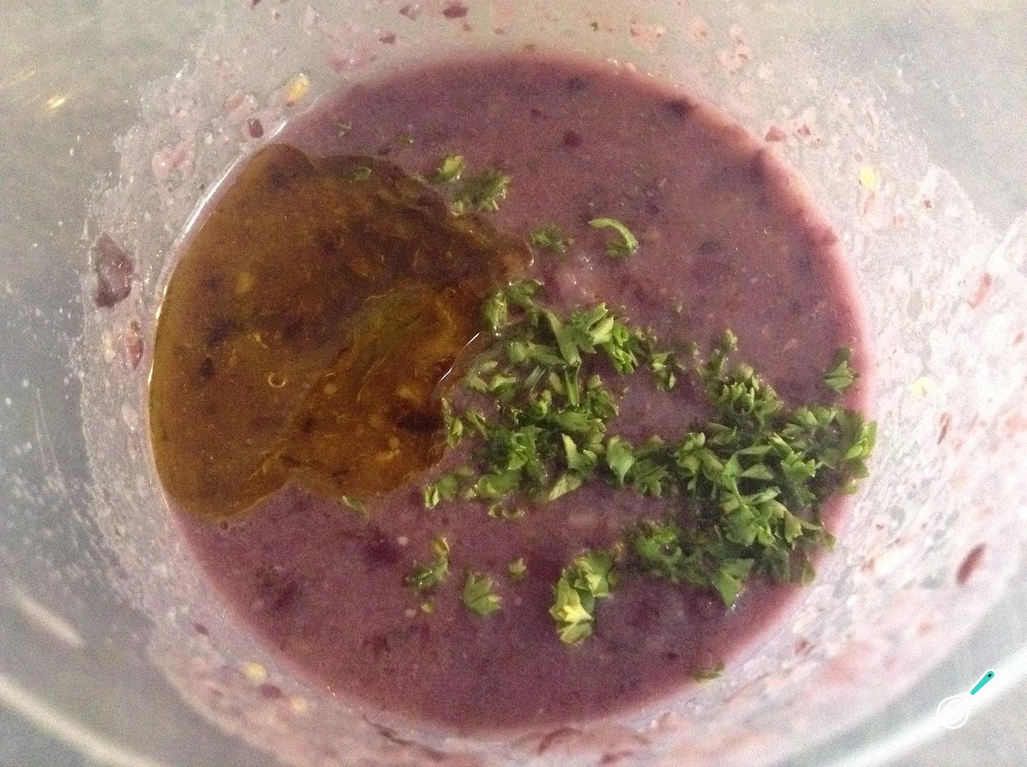Coloque o feijão preto com um pouco de água em um recipiente e junte a cebola cortada em pedaços médios. Processe tudo no processador de alimentos ou bata no liquidificador. Junte o suco de limão, a pimenta do reino, o sal e a pasta de alho e volte a bater tudo.