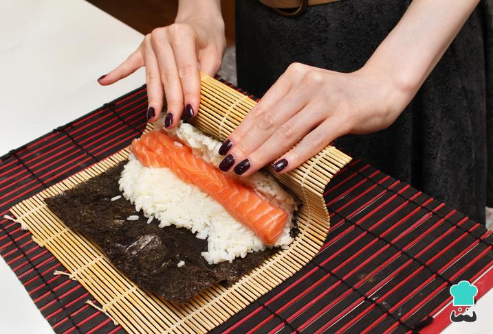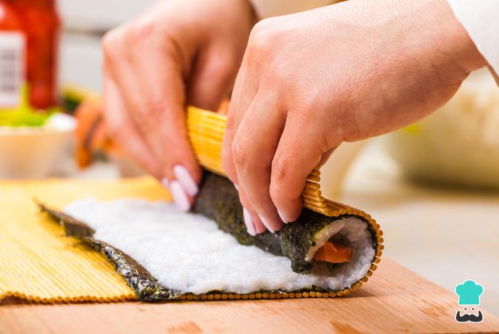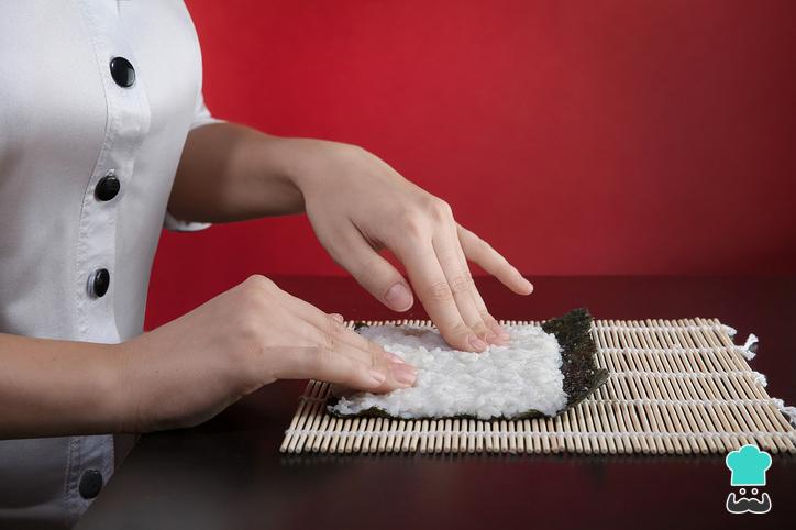 Para começar a fazer seu hot roll com cream cheese, terá que possuir uma esteira para enrolar sushi (sudarê) ou substituir por algo que acredite que faça a mesma função. Sobre a esteira coloque a nori (que deve estar na horizontal e com o lado opaco virado para cima).