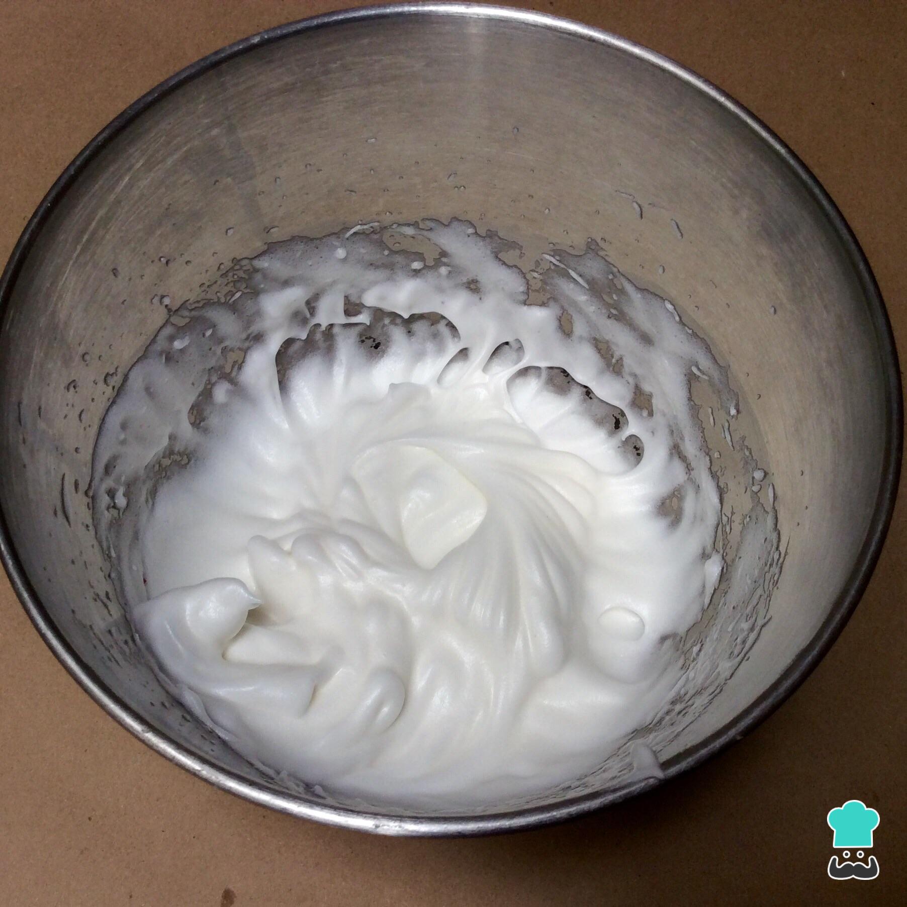 Para fazer esta receita de ilha flutuante fácil comece por separar as claras das gemas e bater as claras em neve junto com 90 gramas de açúcar, até obter um merengue brilhante que forma picos.