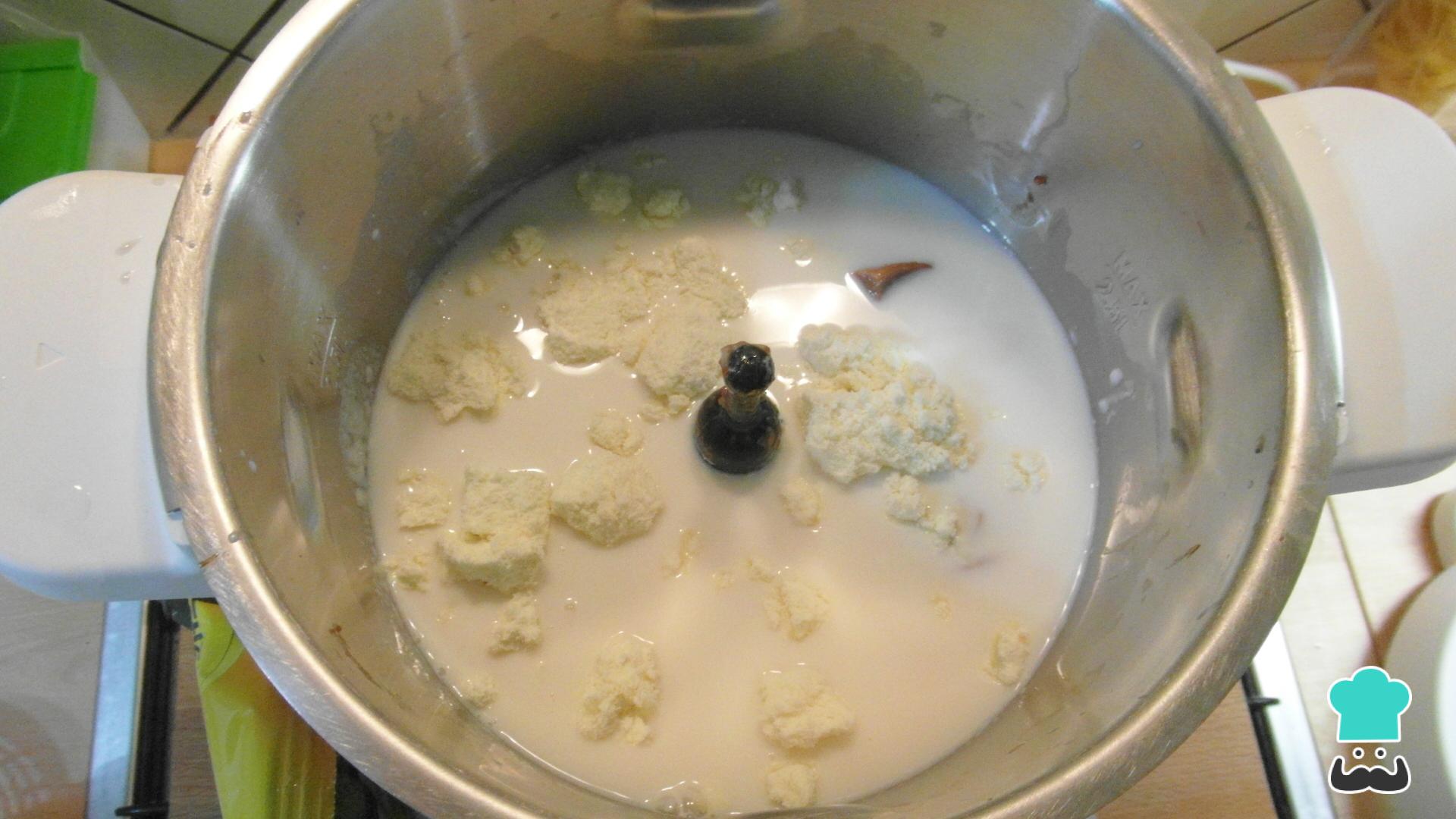 O passo seguinte desta receita de iogurte caseiro é transferir a mistura anterior para uma panela e acrescentar o leite em pó. Leve ao fogo médio, mexendo de vez em quando com um batedor de claras, até quase ferver.