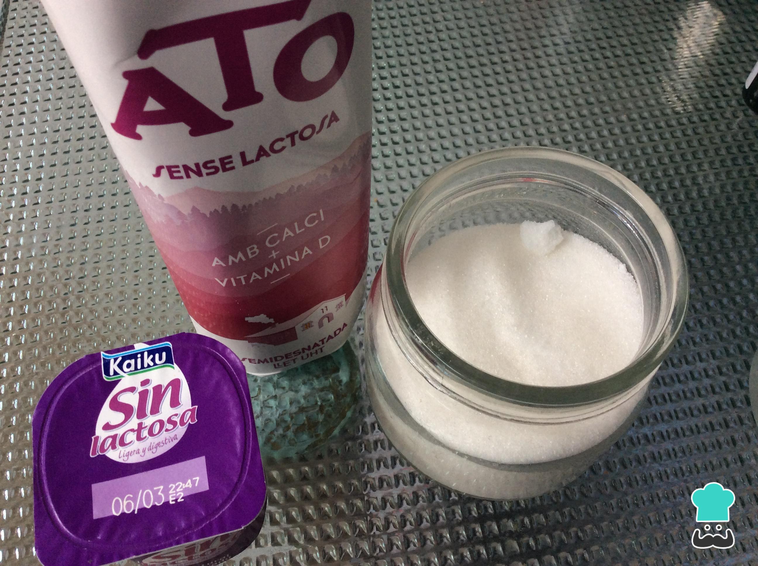 Aqui temos os ingredientes para a preparação de iogurtes caseiros sem lactose. Vamos precisar de um iogurte - livre de lactose, obviamente - como base, para fermentar. O leite também é livre de lactose, e você pode optar por comprá-lo desnatado ou parcialmente desnatado. Eu optei por esta última opção, caso contrário, o iogurte fica muito líquido para meu gosto. O açúcar é opcional. Em algumas receitas pode adicionar leite em pó para engrossar o iogurte, mas não é necessário.