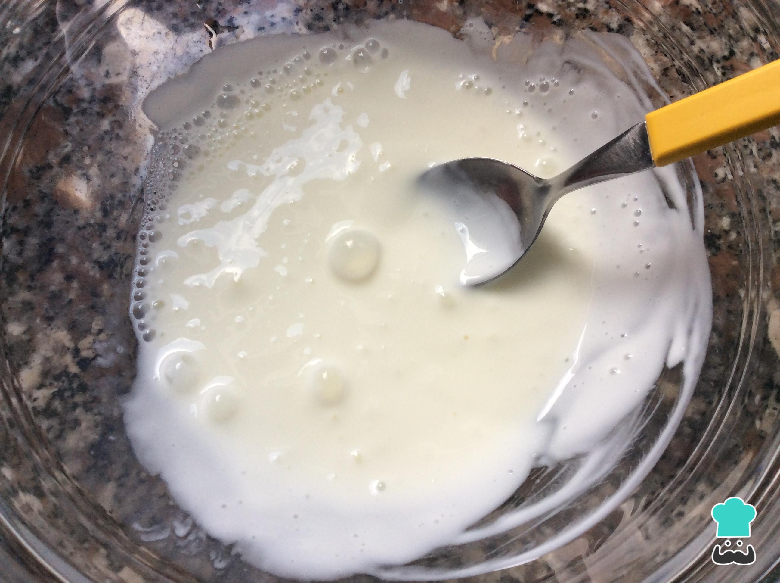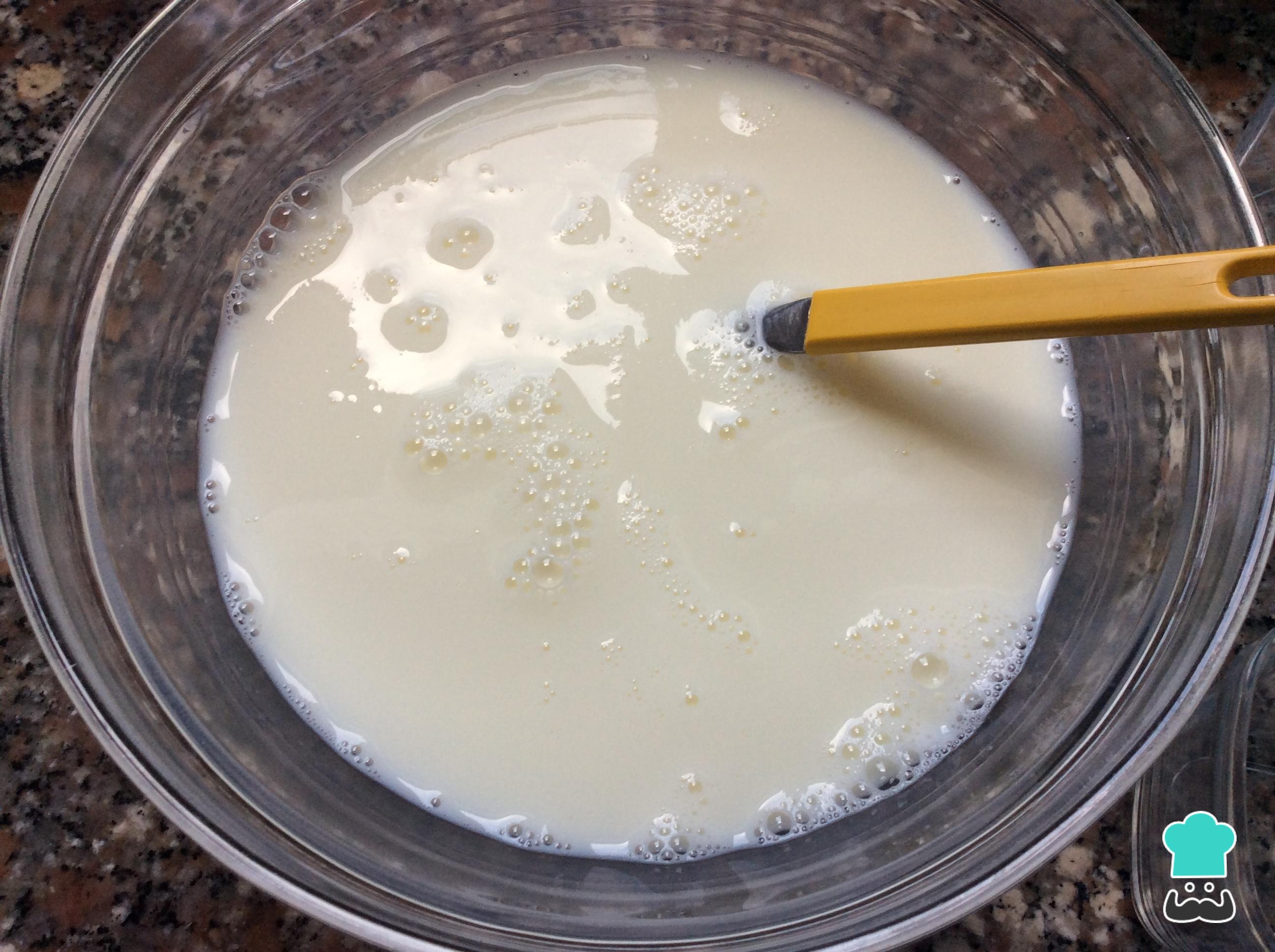 Despeje o iogurte sem lactose numa tigela e mexa. Preparamos num recipiente de medição a quantidade de leite sem lactose que precisará (750 mililitros) e despeje um fio pelo iogurte. Mexa bem a mistura.