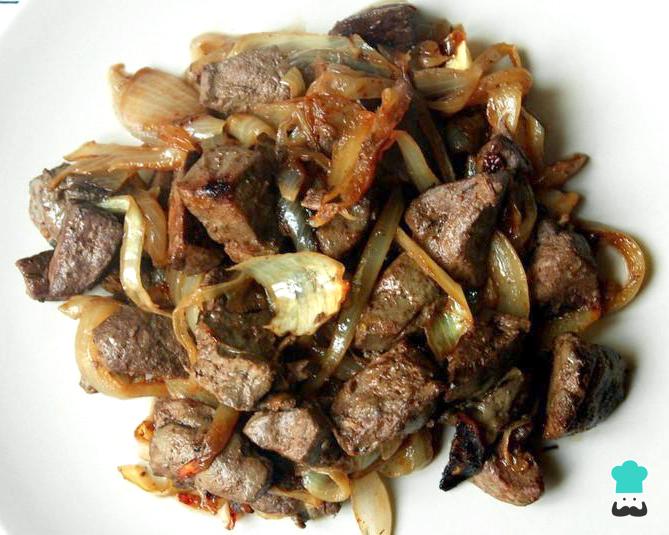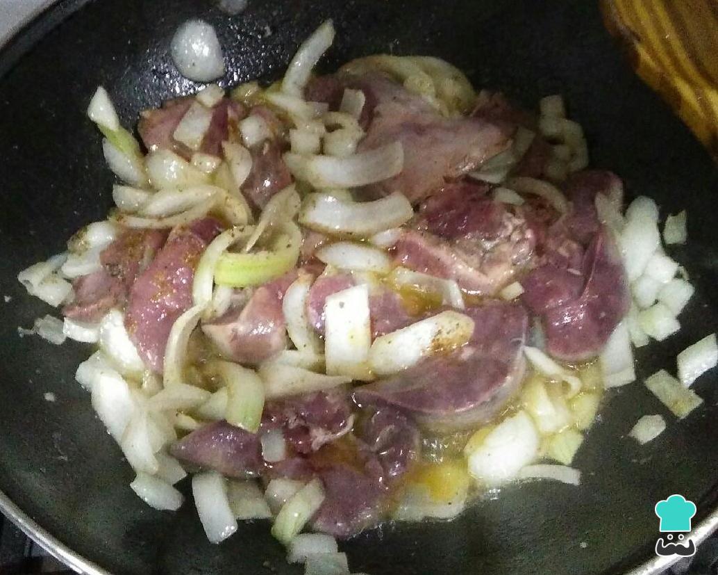Leve ao fogo médio uma frigideira com um fio de azeite e refogue nele a cebola picadinha ou cortada em julienne até que fique transparente. Depois baixe o fogo, coloque o fígado e cozinhe junto até o fígado ficar no ponto certo (nem muito mole, nem duro).