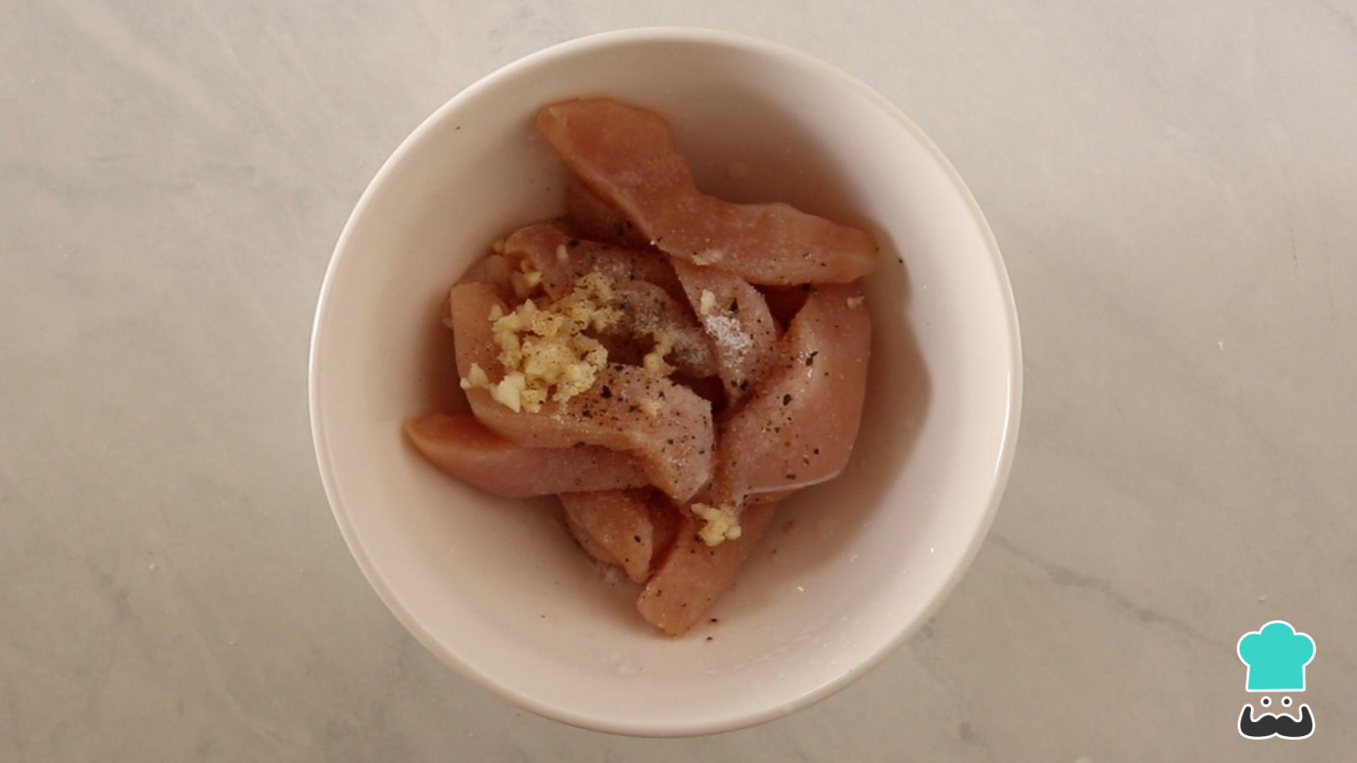 Em uma tigela, coloque as tiras de frango e tempere com o limão, o alho, sal e a pimenta a gosto.