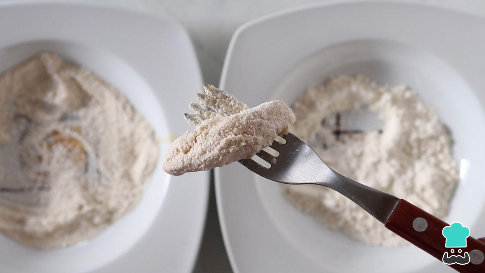 Disponha cada farinha em dois pratos diferentes e empane as tiras de frango na seguinte ordem: ovo, farinha de trigo e farinha de rosca.