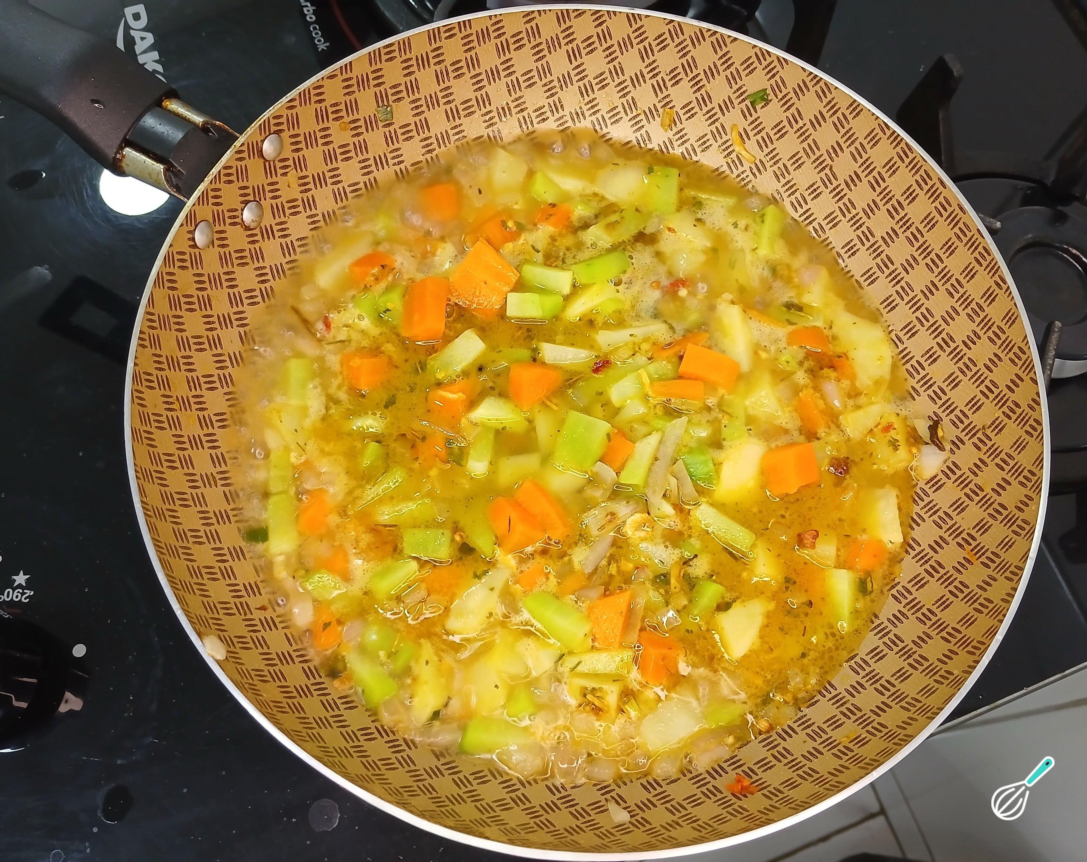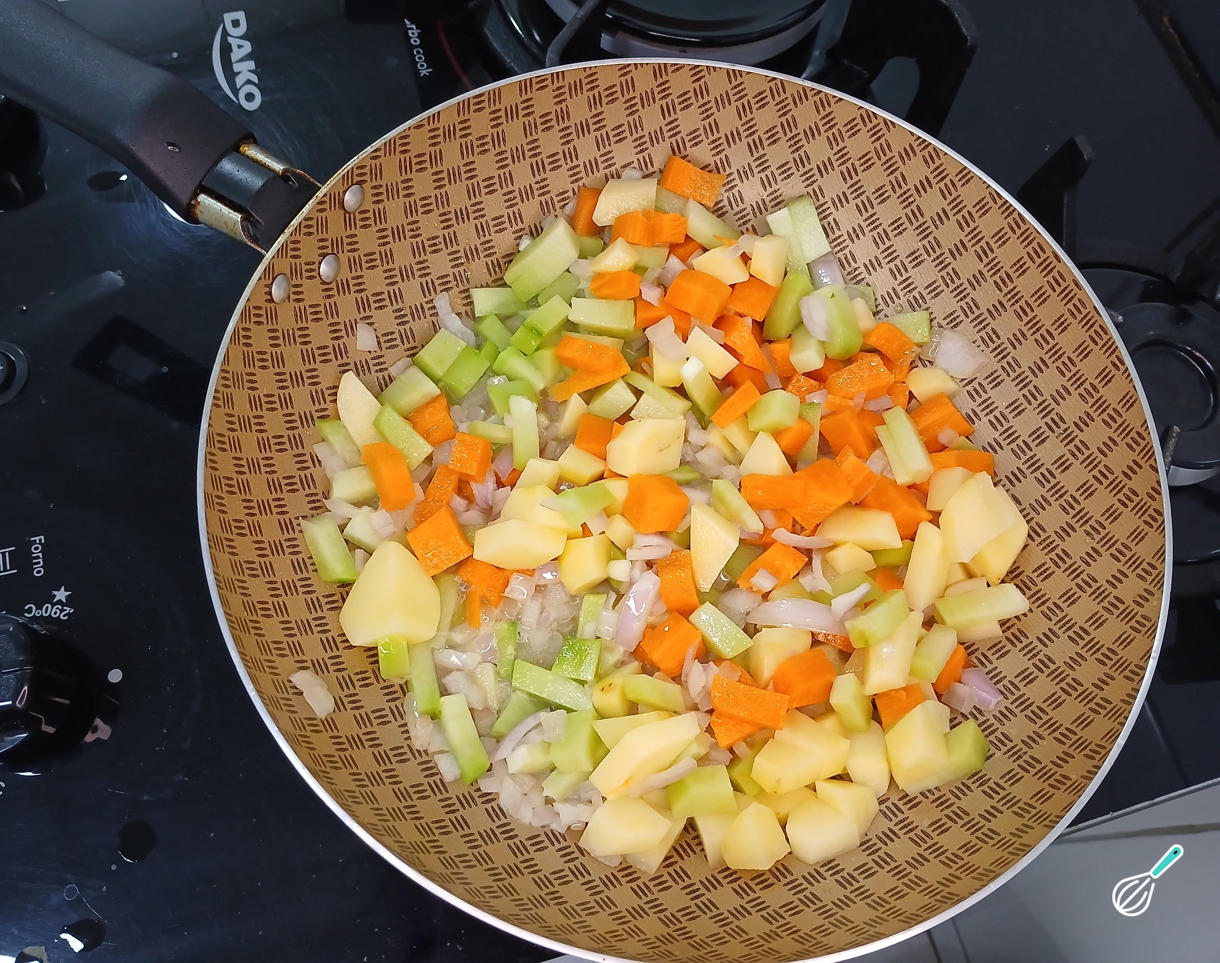 Em seguida adicione a batata, a cenoura, a cebola roxa e o chuchu. Misture tudo muito bem com uma colher de pau para refogar os legumes.