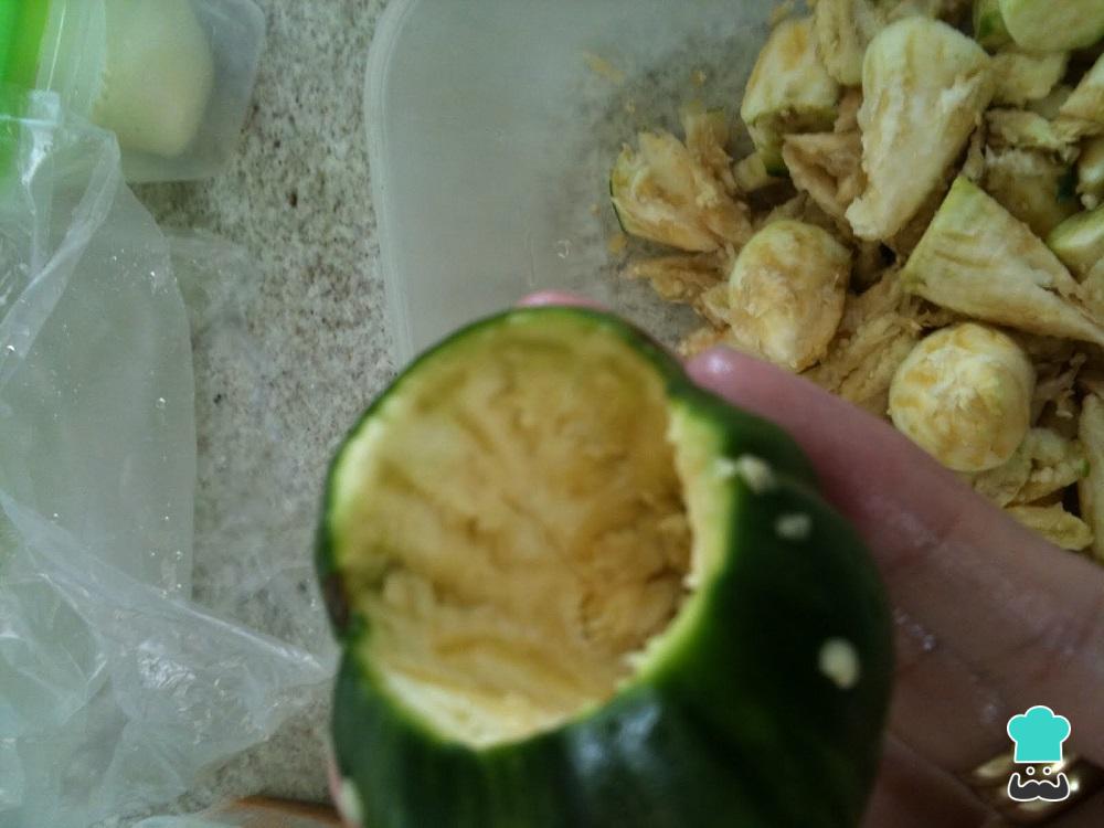 Recheie os jilós com a mistura do passo anterior. Coloque-os em uma travessa de forno e leve a assar em forno médio preaquecido por 20 minutos.