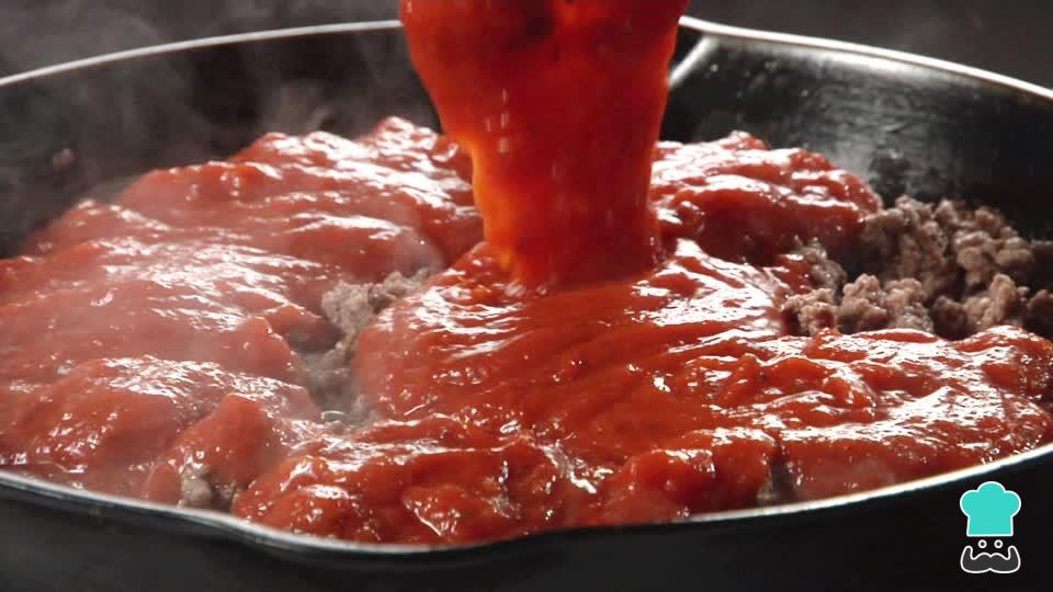 De seguida, refogue a cebola e o algo em uma panela com um fio de azeite. Junte a carne moída e a polpa do jiló e deixe cozinhar. Junte o molho de tomate e misture tudo.