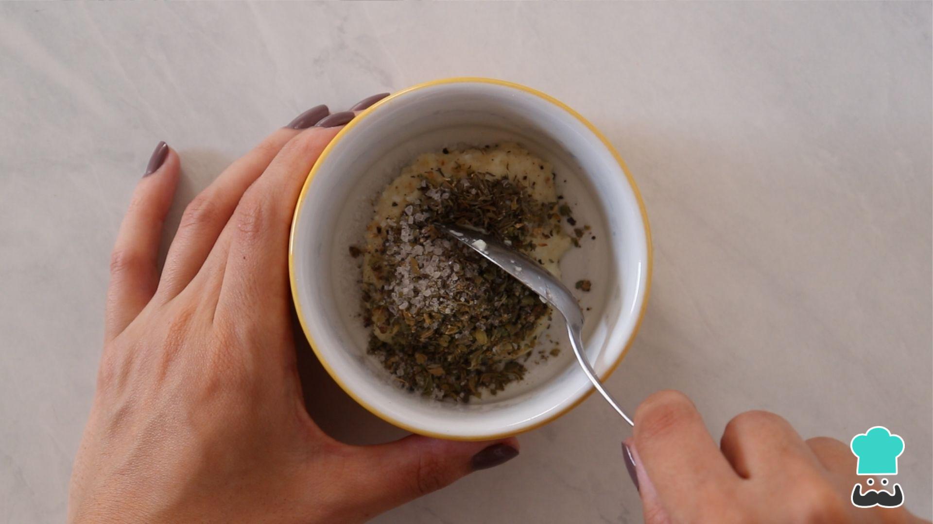 Pique a cebola e o alho e, em uma tigela, misture com o orégano, tomilho, sal e pimenta em quantidade a seu gosto.