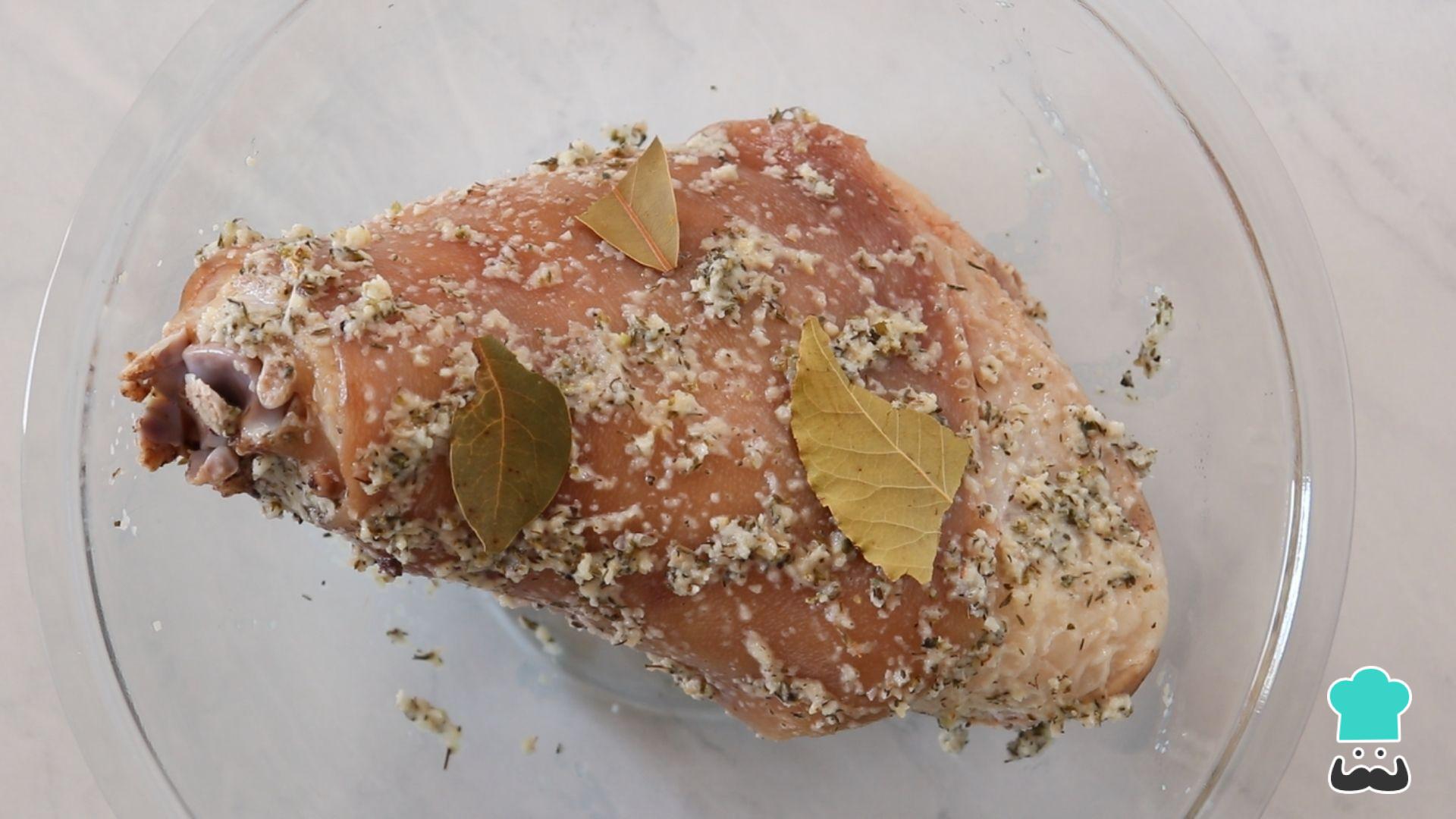Espalhe o tempero no joelho de porco, junto com as folhas de louro, coloque em uma tigela e cubra com papel filme. Deixe na geladeira por 12 horas para pegar bem o gosto.