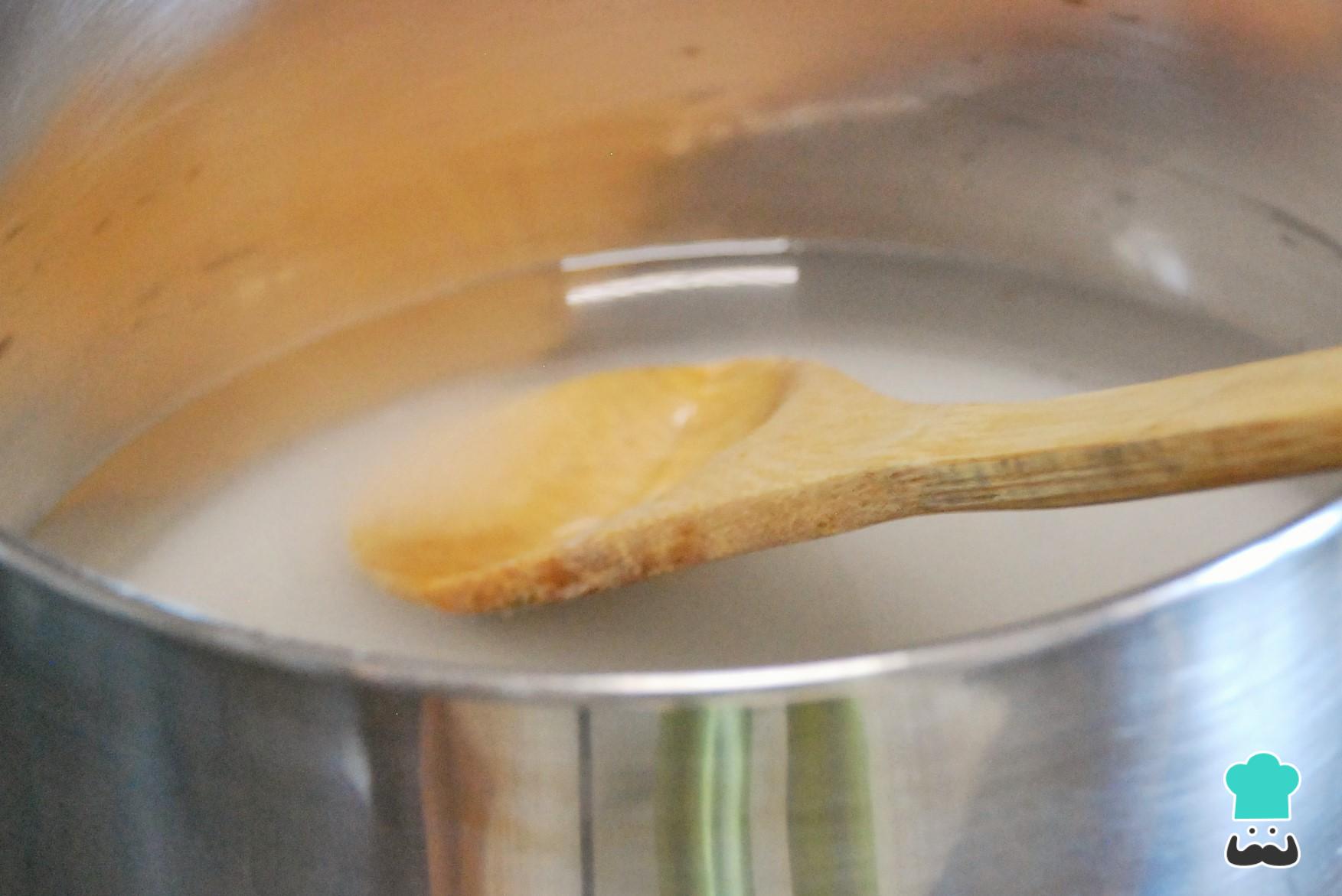 Misture a água com o açúcar e leve ao fogo médio até este se dissolver por completo. Use uma colher de madeira para mexer.