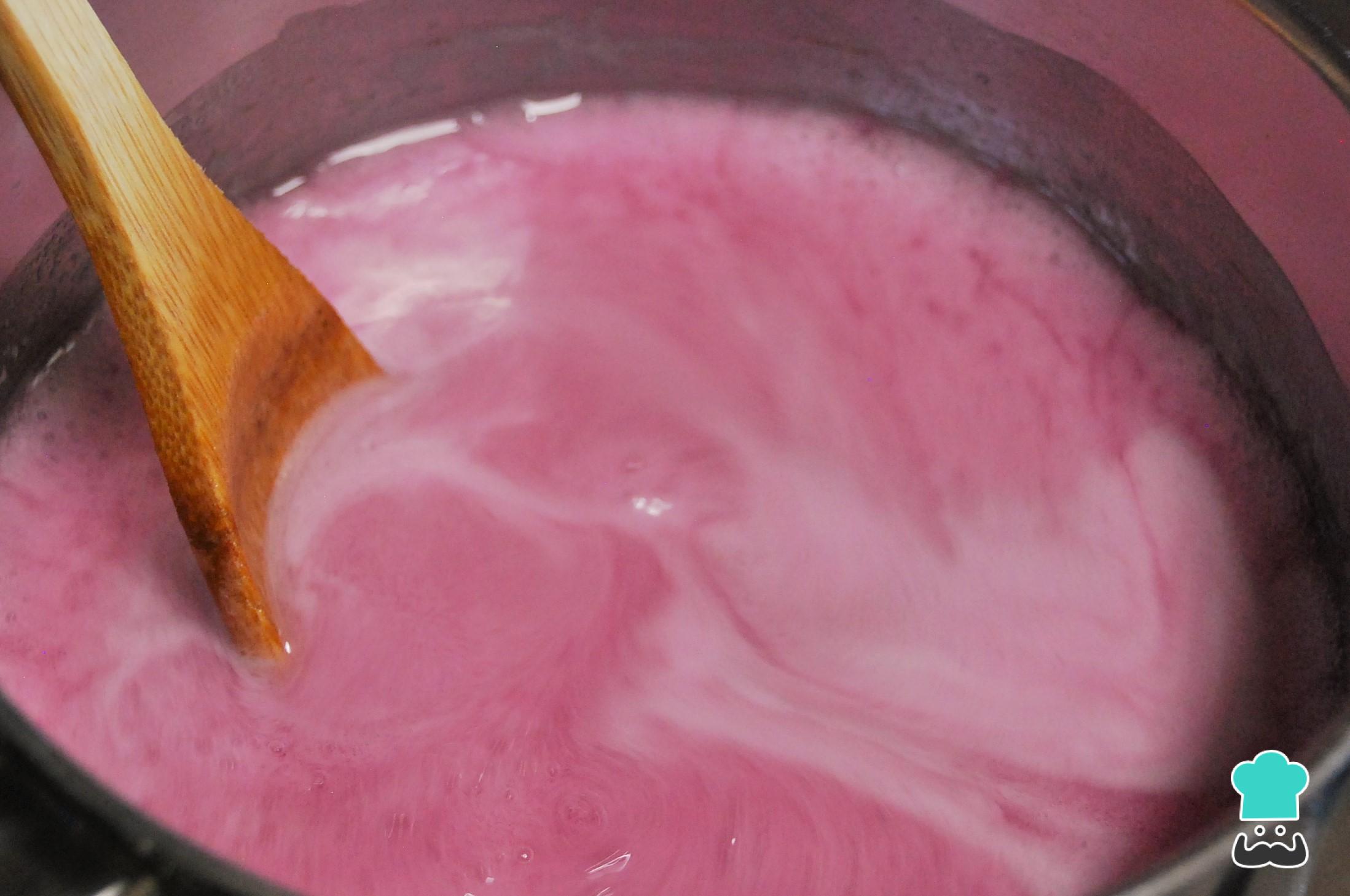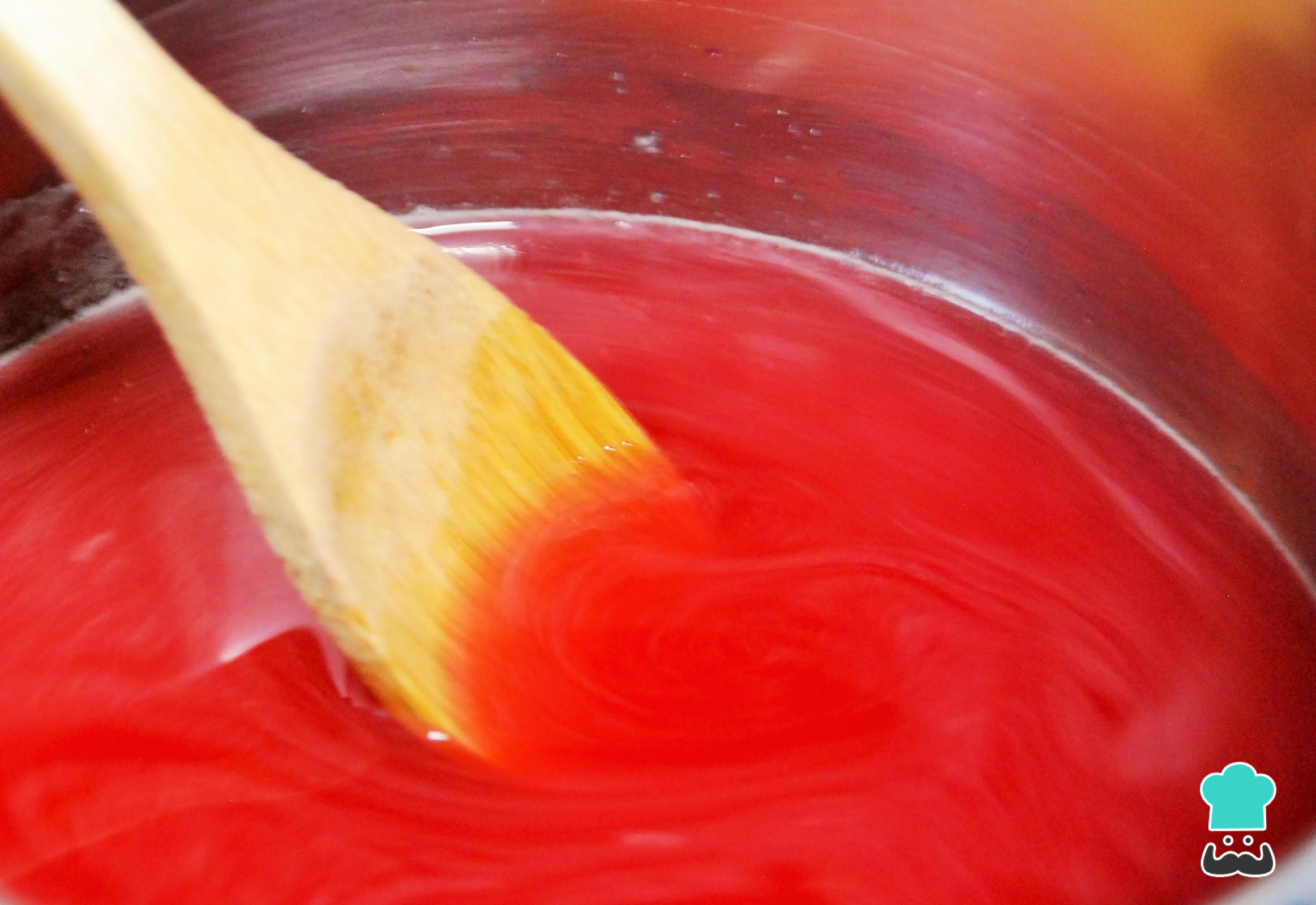 Quando ferver, adicione a gelatina de sabor. Eu usei gelatina de framboesa, mas você pode usar o seu sabor preferido. Abaixe o fogo ligeiramente e misture até dissolver.