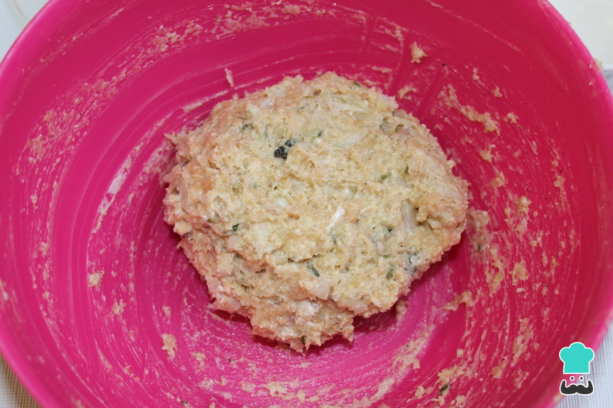 Para preparar esta receita de kafta de frango comece por misturar bem todos os ingredientes em uma vasilha, até obter uma massa fácil de modelar.