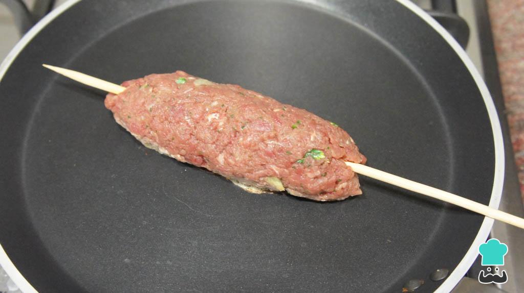 Modele a massa em redor dos espetos de madeira, de forma a conferir-lhes o formato cilíndrico típico de kafta.