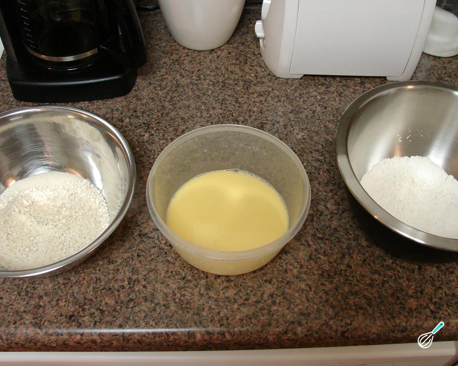 Bata os ovos com uma pitada de sal e reserve. Coloque numa tigela a farinha de trigo e, noutra tigela coloque a o panko ou farinha de rosca. Estes são os ingredientes usados para empanar kani kama.