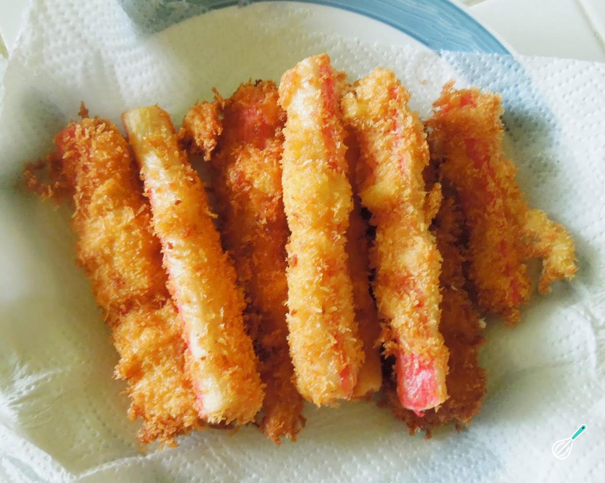 Esquente o óleo numa frigideira. Envolva os palitinhos de kani na farinha de trigo, depois nos ovos batidos e, por último, no panko ou farinha de rosca. Coloque fritando quando o óleo estiver quente por 2-3 minutos ou até dourarem. Retire para um prato com papel absorvente, para eliminar o excesso de óleo.