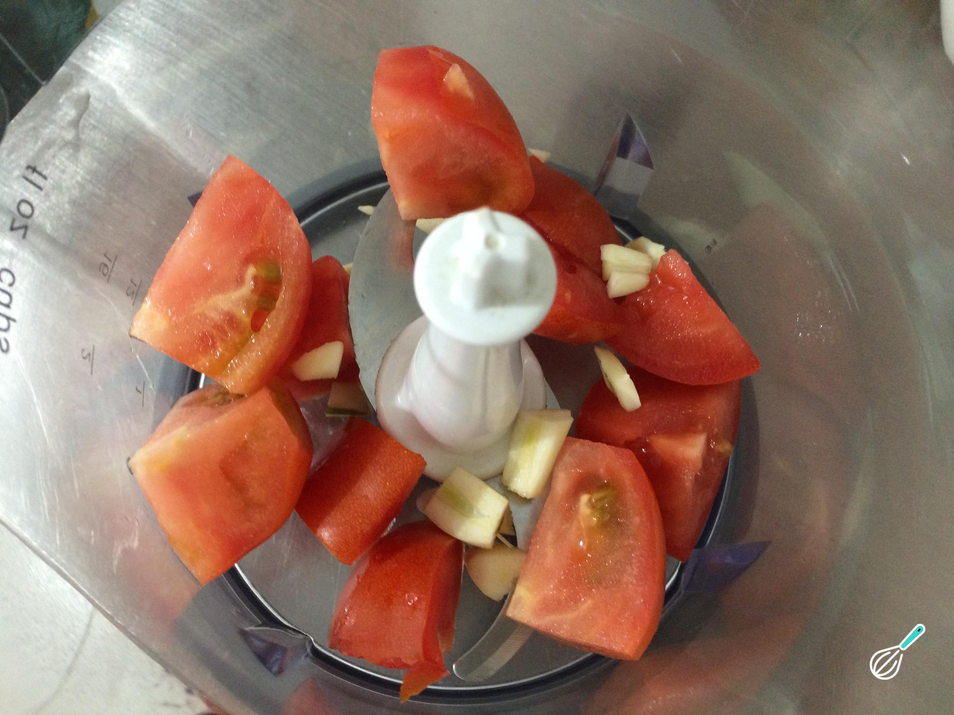 Em um processador de alimentos coloque os tomates cortados em pedaços e os dentes de alho. Triture bem, de forma a obter uma pasta não muito líquida.