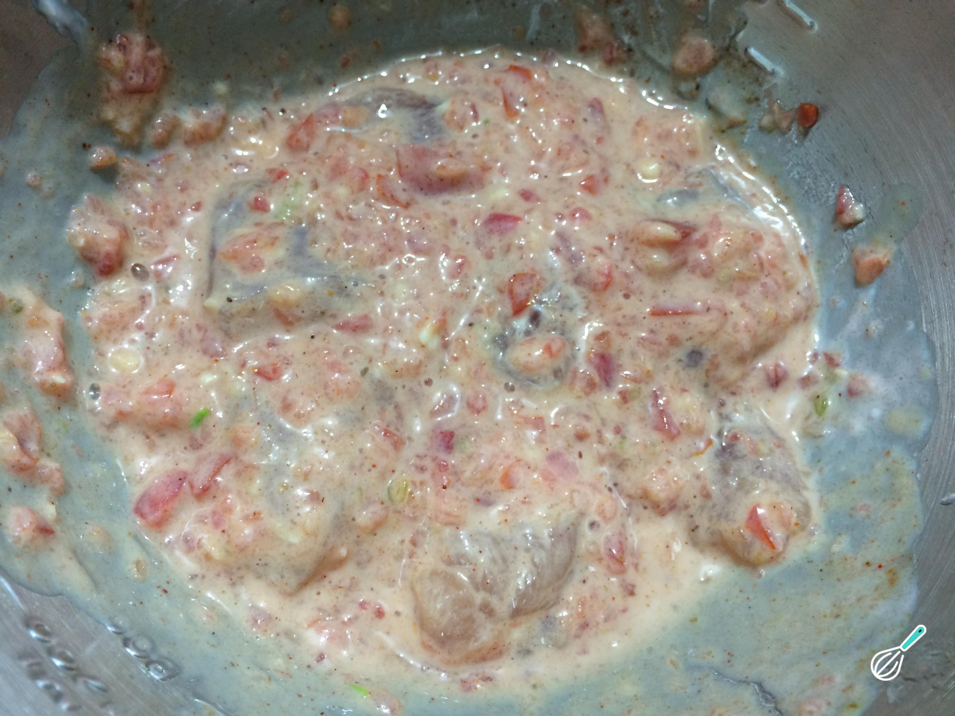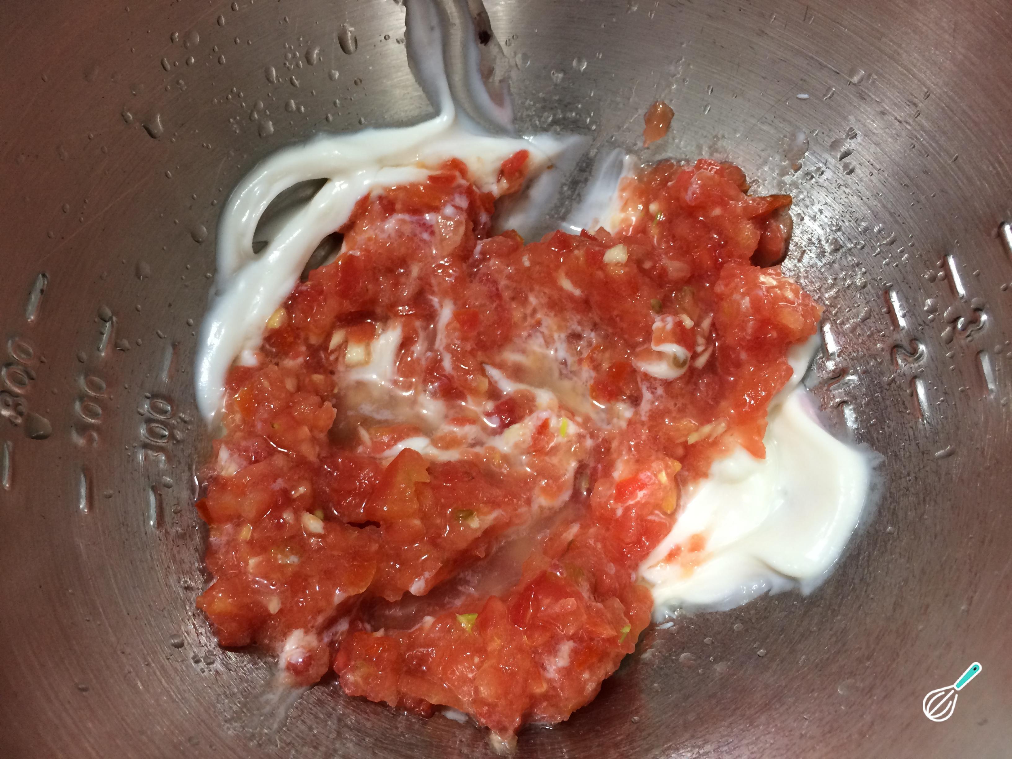 Misture a pasta de tomate e alho com o iogurte e o suco de limão. O resultado deve ser uma mistura homogênea para temperar o frango.