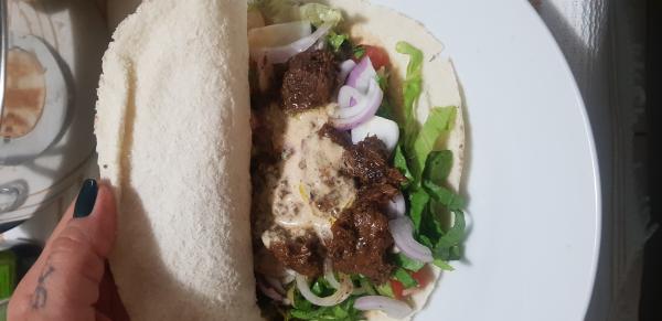 Finalmente monte o seu döner kebab caseiro: esquente os pães sírios ou árabes numa frigideira sem óleo, chapa ou forno, até inflarem. Abra ao meio e recheie com a carne e os legumes.