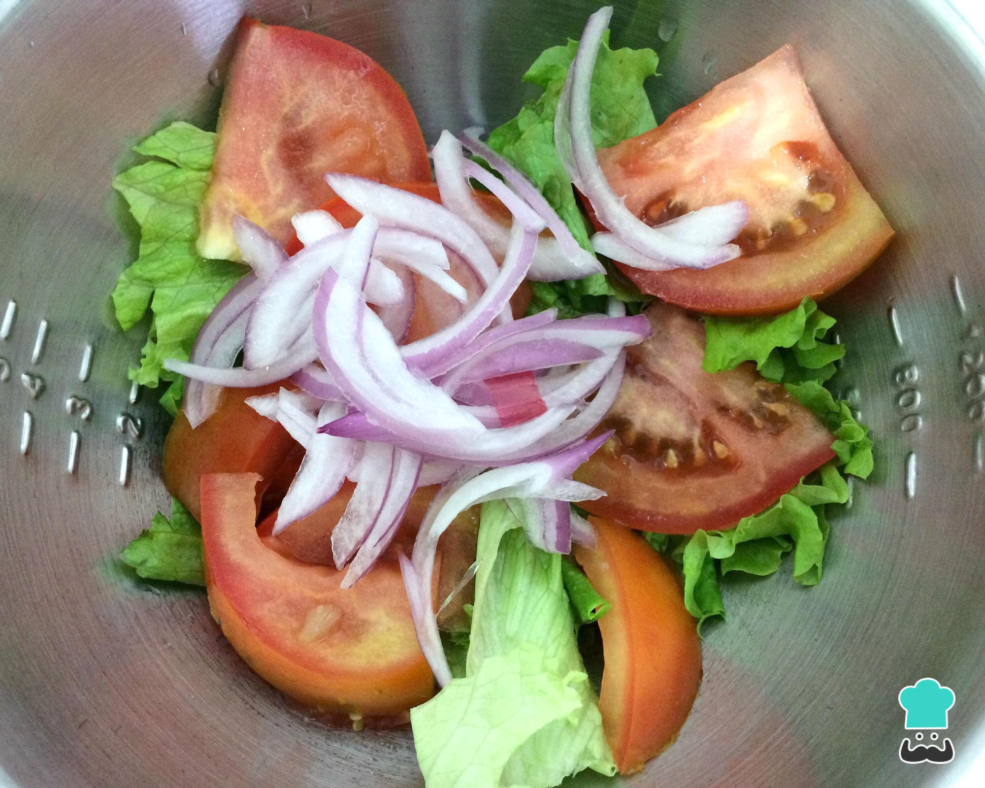Enquanto isso, prepare os legumes para montar seu kebab caseiro: lave as folhas de alface e os tomates e descasque as cebolas. Enrole as folhas de alface juntas e corte-as em tiras, corte os tomates e as cebolas em rodelas. Reserve.