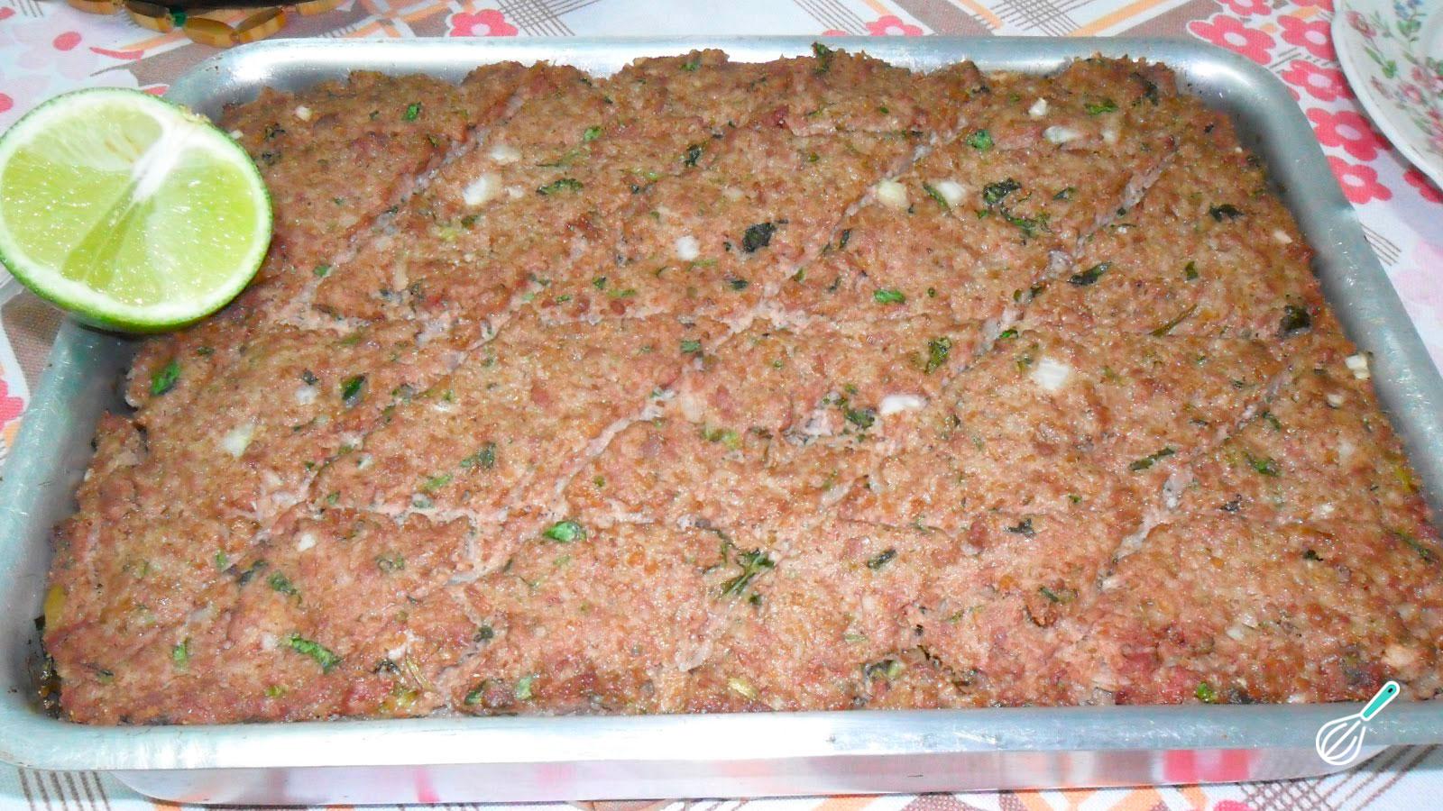 Em seguida misture a carne moída com o trigo, a hortelã, a cebola, o sal, a pimenta, o alho e o suco de limão.