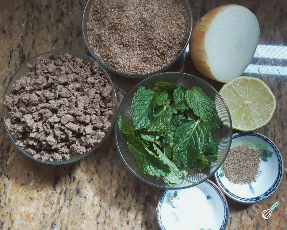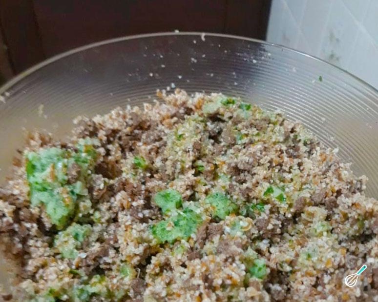 Bata no liquidificador ou processador a cebola, o alho, o azeite, o suco de limão e a hortelã. Misture esses ingredientes com a carne de soja e o trigo já hidratados e escorridos.