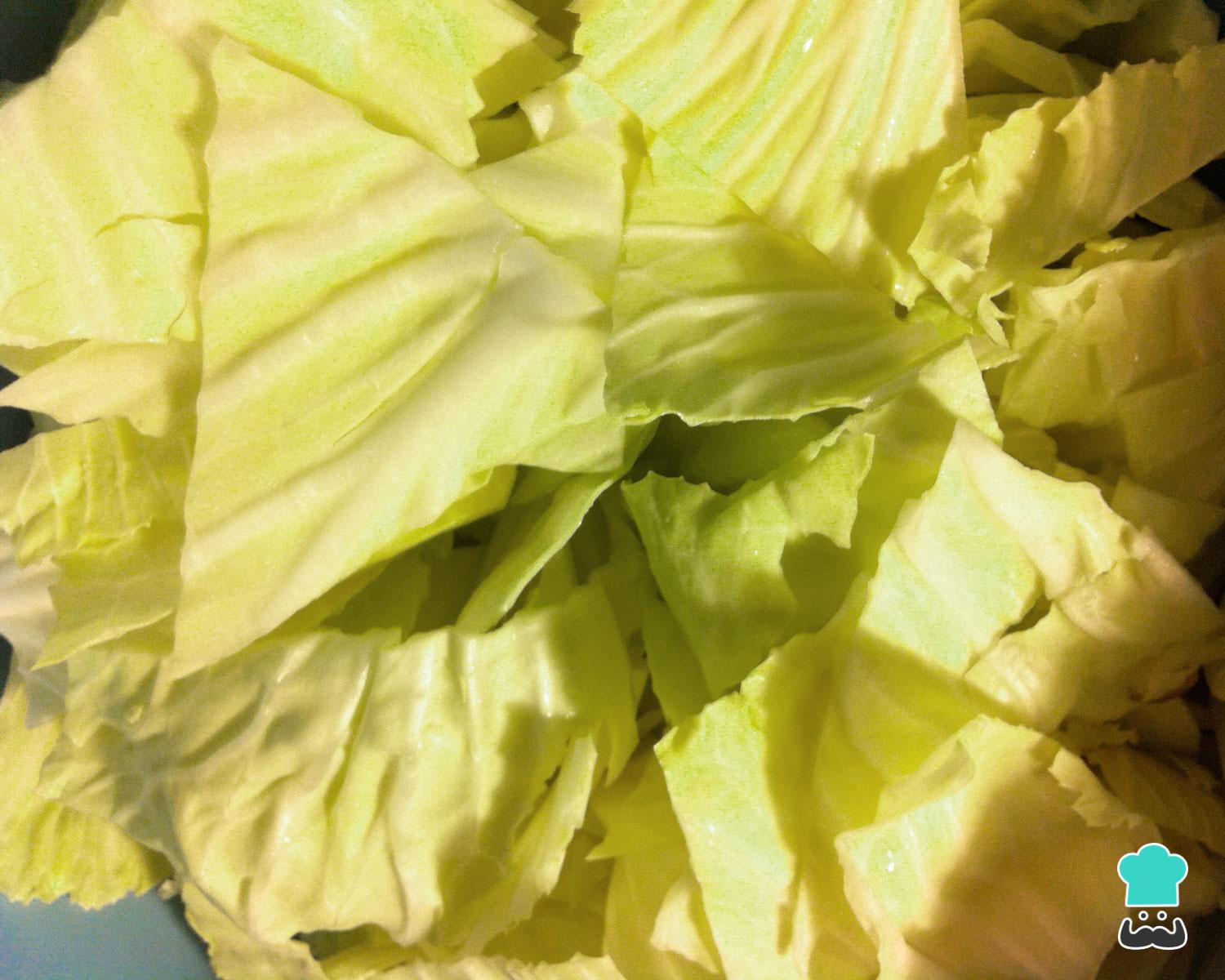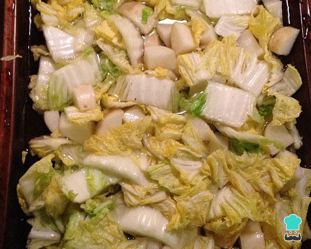 Primeiramente separe as folhas da acelga ou do repolho-chinês, eliminando as que estão ruins (murchas ou amarelas). Pique em pedaços grandes as folhas com o talo junto.